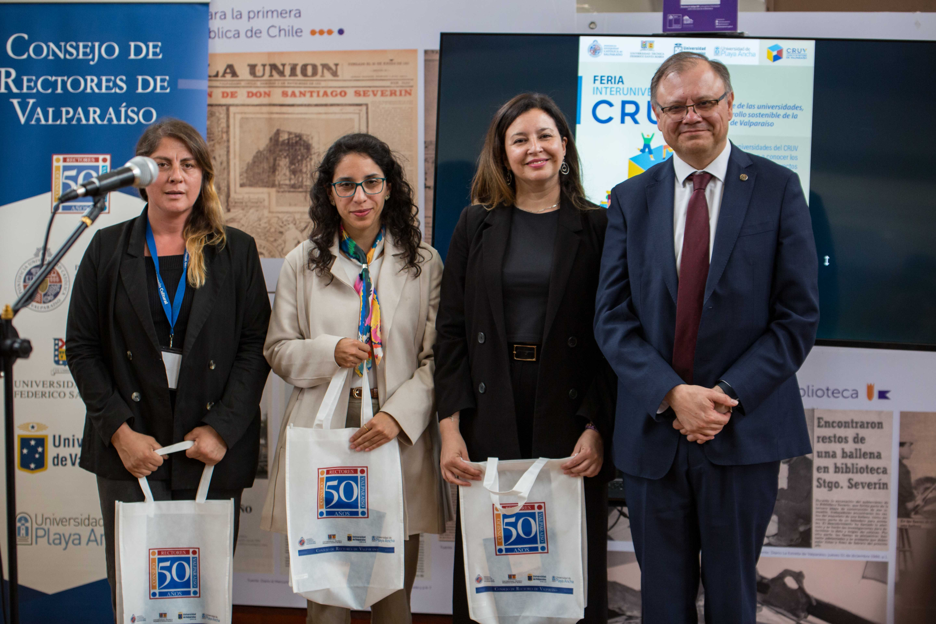 En la ceremonia de inauguración de la feria estuvieron presentes Osvaldo Corrales, rector de la UV y presidente del Consejo de Rectores de Valparaíso; Carlos González, rector de la Universidad de Playa Ancha; Juan Yuz, rector de la Universidad Técnica Federico Santa María; Nicole Galdames, directora de Desarrollo Económico y Cooperación Internacional de la Municipalidad de Valparaíso, en representación de la alcaldesa Camila Nieto; Francisca Araneda, directora de la Biblioteca Pública Santiago Severín; Tomás Morales, director regional de la Junta Nacional de Auxilio Escolar y Becas (Junaeb); Marcos Faúndez, director regional del Servicio Médico Legal; Carolina Zapata, seremi de Gobierno; Felipe Mellado, subdirector regional de Corfo; Mario Lagomarsino, secretario técnico del Consejo Regional de Valparaíso, junto a autoridades centrales y académicas de las universidades del CRUV, invitadas e invitados especiales y público general.