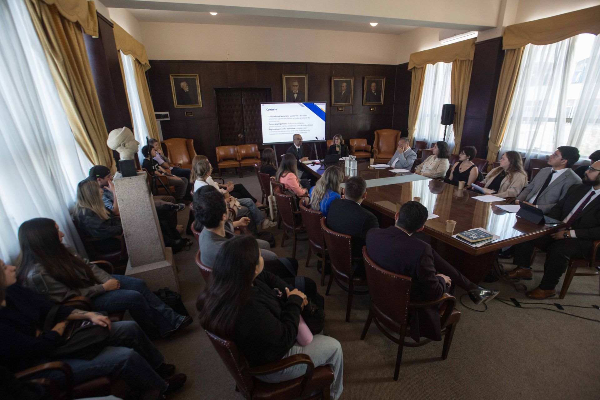 Posteriormente, se abrió un espacio de diálogo con el PhD Rodrigo Polanco Lazo, académico de la Universidad de Berna, quien entregó comentarios y sugerencias al informe. Finalmente, se llevó a cabo una mesa redonda de discusión, junto a Jorge Gilbert, profesor de la Escuela de Ingeniería Comercial de la UV; Nicole Pastene, presidenta titular de la Empresa Portuaria de Valparaíso (EPV); y representantes de la Subsecretaría de Relaciones Económicas Internacionales.
