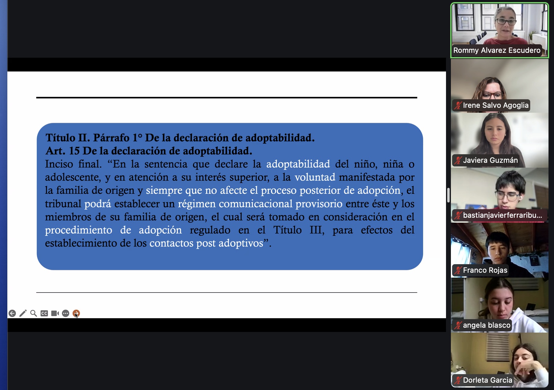 Asimismo, la profesora Rommy Álvarez participó en una sesión de clases conjunta con Irene Salvo Agoglia, académica de la Facultad de Educación de la Universidad de Barcelona e investigadora Ramón y Cajal del Grupo de Investigación en Intervenciones Socioeducativas en la Infancia y la Juventud (GRISU), aportando en interdisciplinariedad e internacionalización al curso optativo Derecho de la Persona, Infancia y Familia de la Escuela de Derecho UV, a la que asistieron telemáticamente las y los estudiantes del curso.