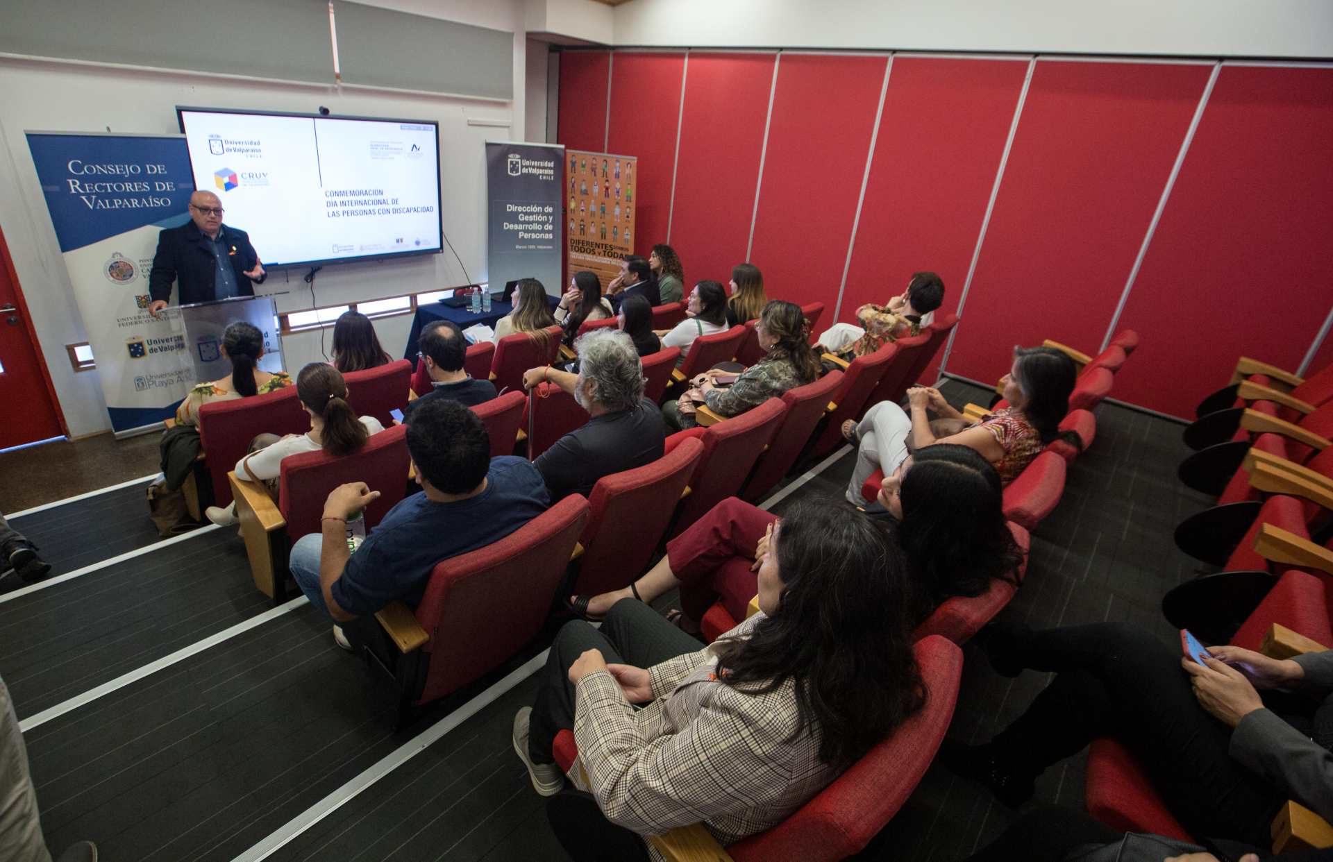 Integrantes del Consejo de Rectores de Valparaíso (CRUV), autoridades regionales, representantes del grupo Miradas Neurodivergentes UV y de la comunidad académica se dieron cita en la conmemoración del Día Internacional de las personas en situación de Discapacidad, organizada por el programa UV Inclusiva de la Dirección de Asuntos Estudiantiles (DAE).
