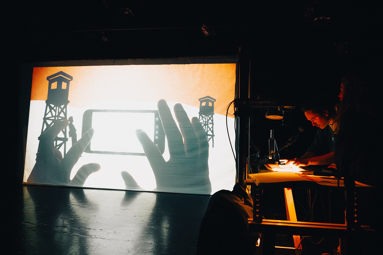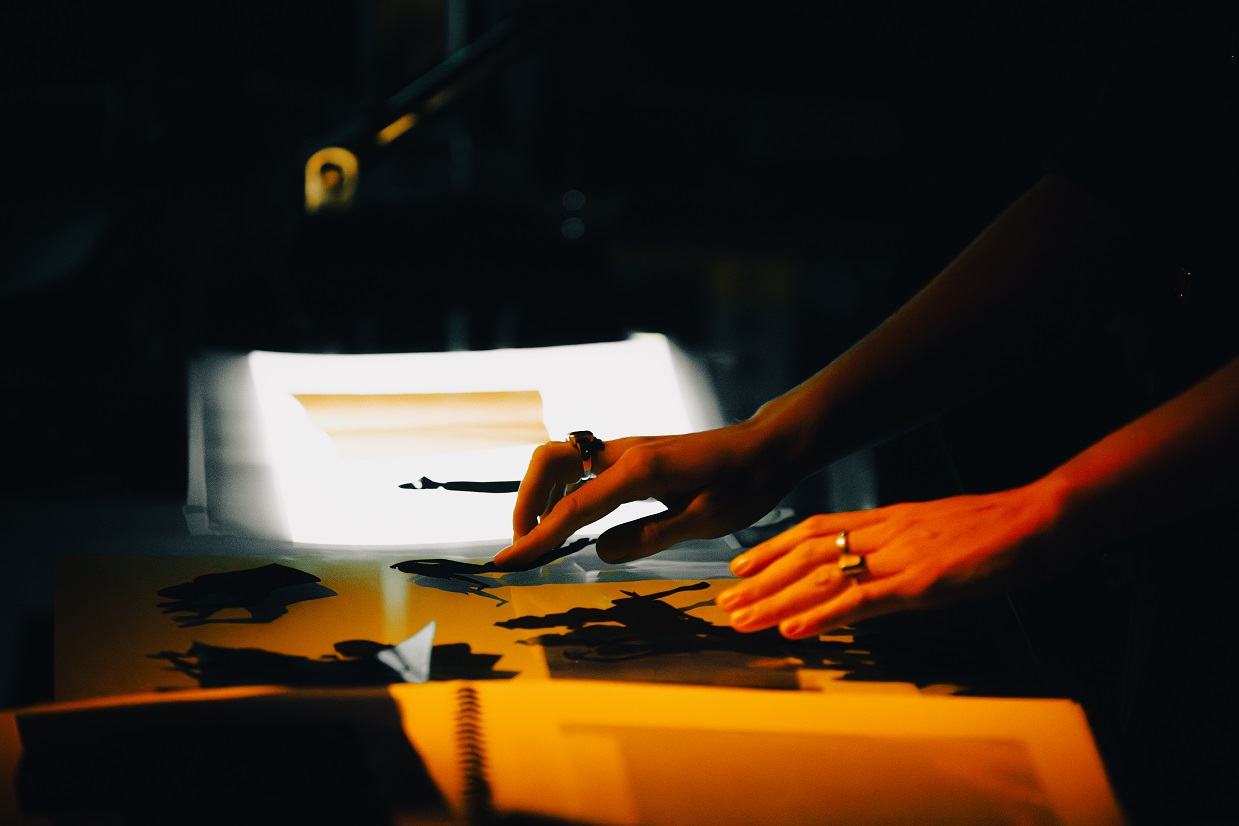 “Hubo que encontrar un lenguaje para cada dimensión del espectáculo. El aspecto documental y contemporáneo del relato aparece a través del iPhone filmado en directo. Las palabras del Cuervo están ilustradas con papel recortado, mientras que los apartes de Óscar y Cosme se traducen de manera más concreta, mediante documentos formales: fotografías, archivos y objetos. La invención del dispositivo escénico es a la vez sencillo y sofisticado: un proyector colocado bajo una placa de vidrio proyecta fondos de color y video sobre papel, donde se manipulan los diversos materiales”, agrega.