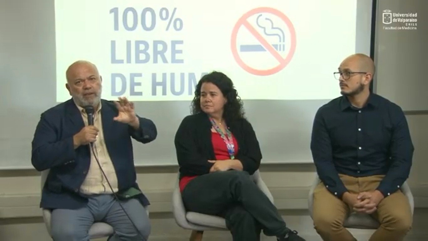 En la actividad —que moderó el profesor Alberto Moreno— intervino en primer término la kinesióloga María Ignacia Grossi, coordinadora de la Red Cardiorrespiratoria de la Escuela de Kinesiología de la UV, quien se refirió al impacto que han tenido las políticas públicas destinadas a controlar el consumo de tabaco a nivel nacional y global.