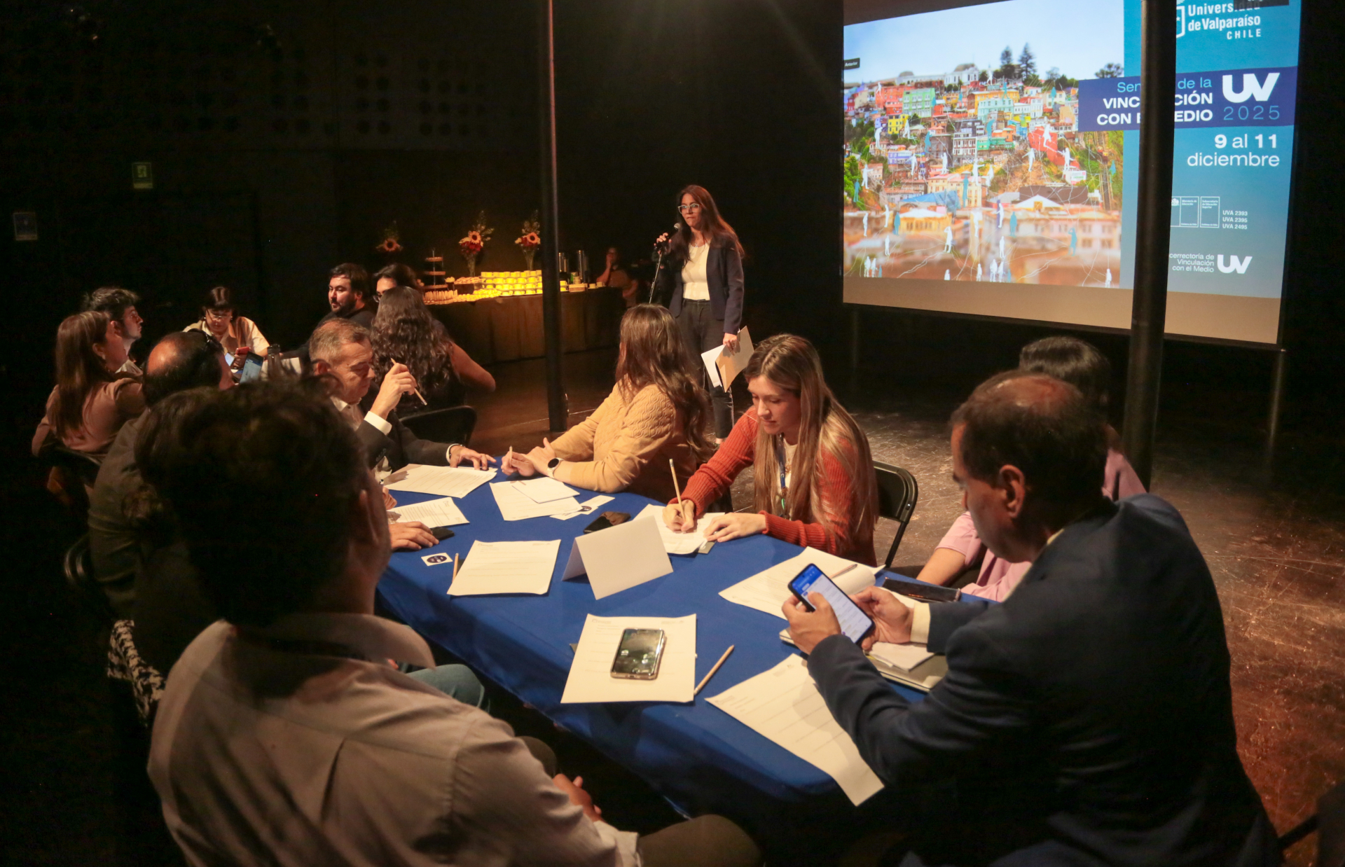 “Estamos finalizando lo que ha sido la Semana de la Vinculación con el Medio. Han sido tres días dedicados a mostrar, a vincularnos dentro de la Universidad y fuera de ella en los proyectos que hemos realizado durante el primer y segundo semestre de este 2025. Y hoy día nos encontramos aquí, en el Teatro Municipal de Viña del Mar, terminando esta semana con el reconocimiento de quienes han sido esenciales para poder llevar a cabo los proyectos y los logros que hemos tenido durante este año, que son los socios estratégicos que han colaborado con nosotros en los TIPE que desarrolla la Vicerrectoría Académica a través de la Unidad de Gestión Curricular y Desarrollo Docente. Quiero agradecer especialmente a Isabel Moffat, que es la coordinadora de las Asignaturas Sello, con quien hemos trabajo estrechamente”, comentó la vicerrectora de Vinculación con el Medio, Paulina Gundelach.
