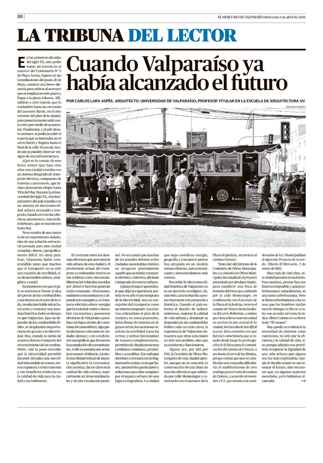 Bajo el título "Cuando Valparaíso ya había alcanzado el futuro", el profesor Carlos Lara, académico de la Facultad de Arquitectura de la Universidad de Valparaíso, publicó una columna en el diario El Mercurio de Valparaíso. En el texto, se refiere al eficiente sistema de electromovilidad de que disponía la ciudad cien años atrás, que kllama la atención en la actualidad a propósito del elevado precio de los combustibles.