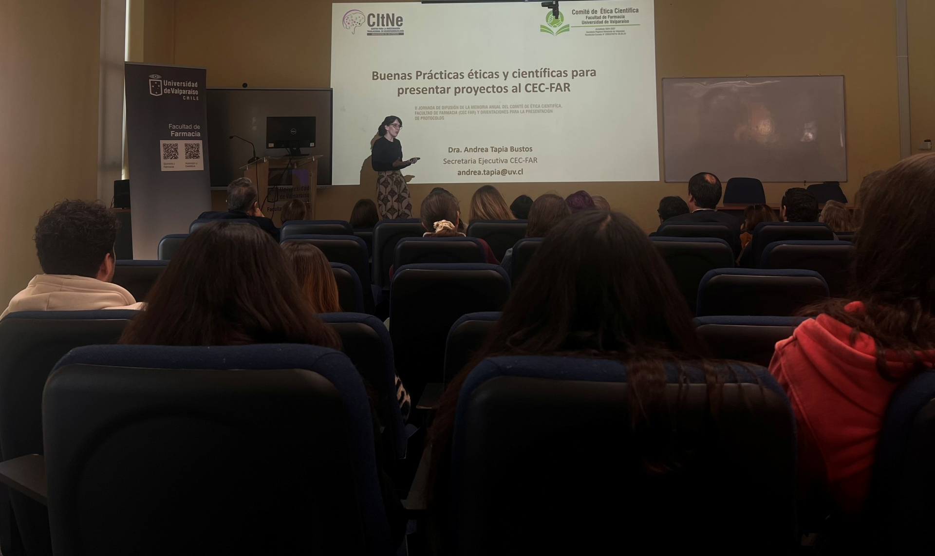 La jornada contó con una amplia participación de autoridades, entre ellas la vicerrectora de Investigación e Innovación, Marcela Alviña; la decana de la Facultad de Farmacia, Caroline Weinstein; la directora de la Escuela de Nutrición y Dietética, Daniela Pincheira, y representantes de otros comités éticos institucionales, junto a académicos, estudiantes y funcionarios.