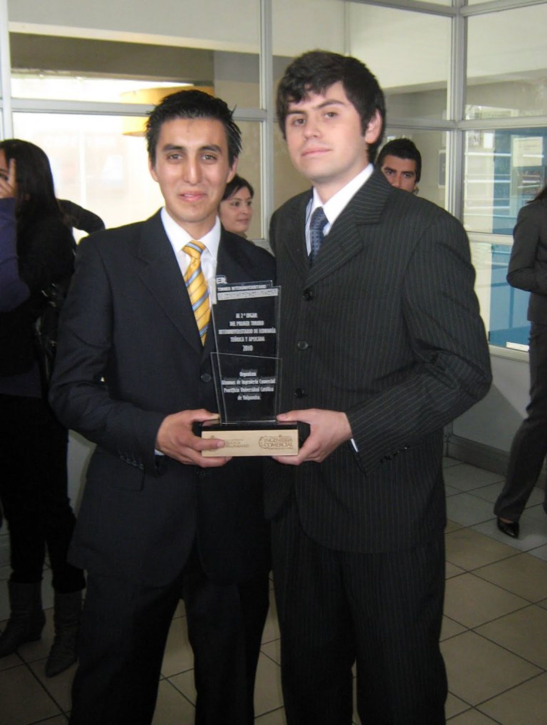 Francisco Álvarez y Juan Olivares, estudiantes de tercer año de la Escuela de Ingeniería Comercial de la Universidad de Valparaíso, obtuvieron el segundo lugar en el Primer Torneo Interuniversitario Regional de Economía Teórica y Aplicada, organizado por la Escuela de Ingeniería Comercial de la Pontificia Universidad Católica de Valparaíso.