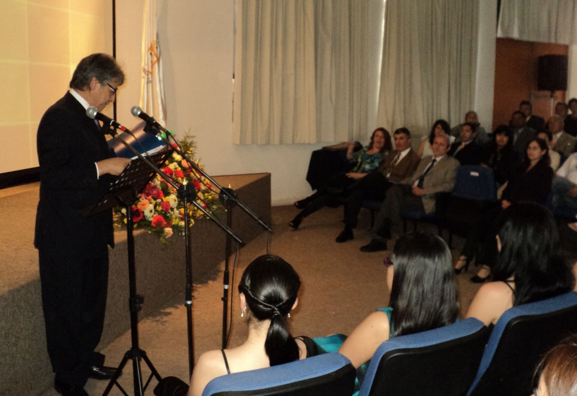 En su discurso, el director de la carrera de Fonoaudiología, Patricio Valdebenito, señaló que “cuando otorgamos el título de fonoaudiólogos, lo que estamos manifestando explícitamente es que la persona que lo obtiene es poseedora de un conjunto de atributos que la acreditan para ser guía y líder en el desarrollo de nuestra región y país”.