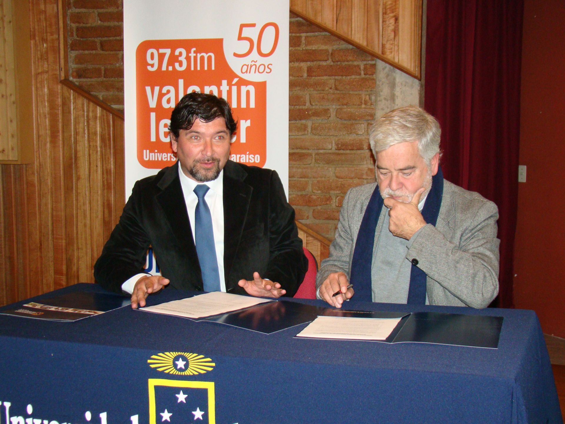 Bajo el eslogan “Las radios que piensan”, los directores Ronald Smith de RVL y Juan Pablo Cárdenas de Radio Universidad de Chile firmaron este acuerdo en una ceremonia desarrollada en la sala Musicámara del Centro de Extensión de la UV.