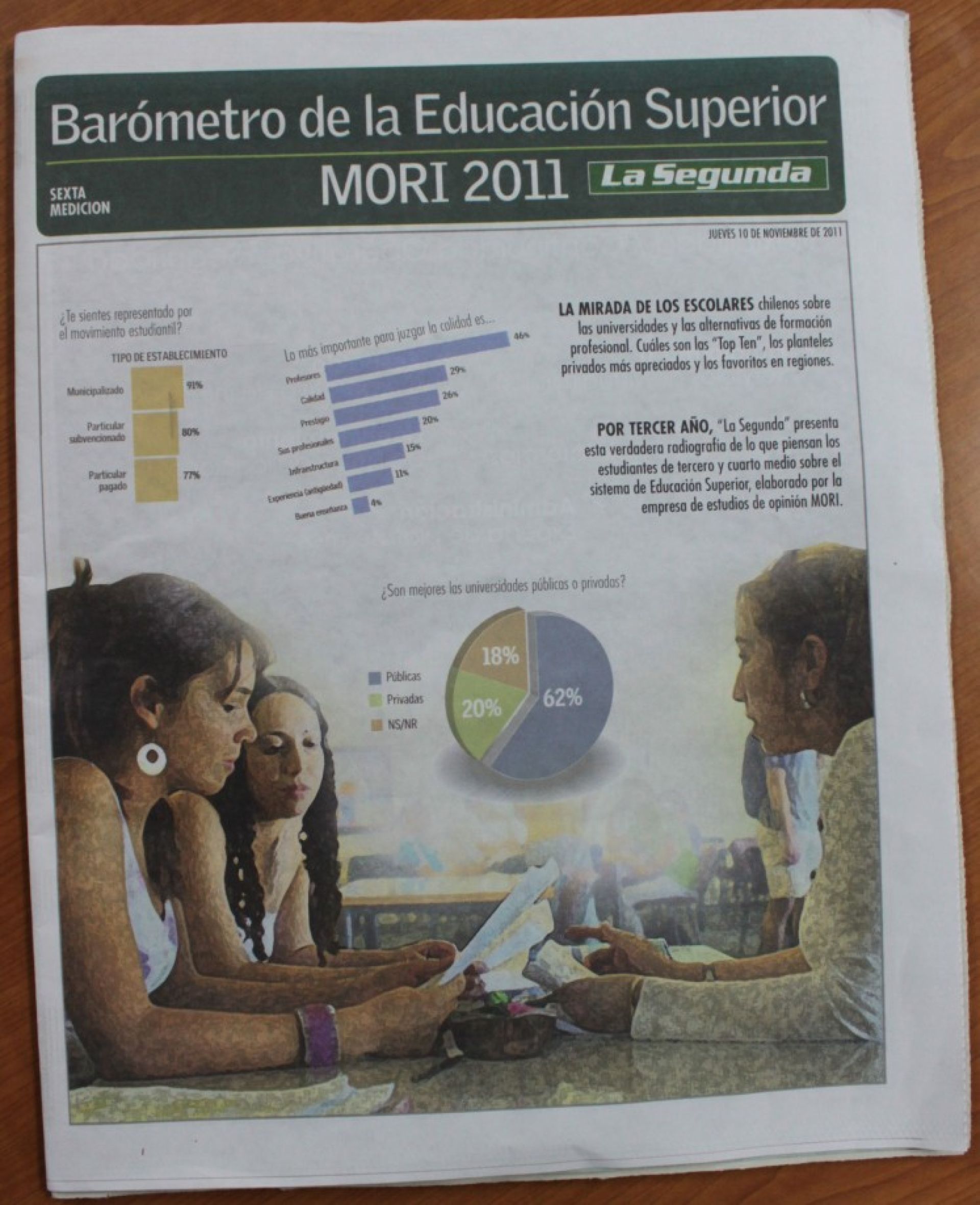Respecto de las universidades públicas, es importante señalar que un 62 por ciento de los estudiantes opina que estas instituciones son mejores que las privadas. Otro dato interesante es que el 61 por ciento de los encuestados señala que le gustaría entrar a una universidad al terminar el colegio, en tanto sólo un catorce por ciento prefiere un instituto profesional, y un seis por ciento escoge trabajar sin estudiar.