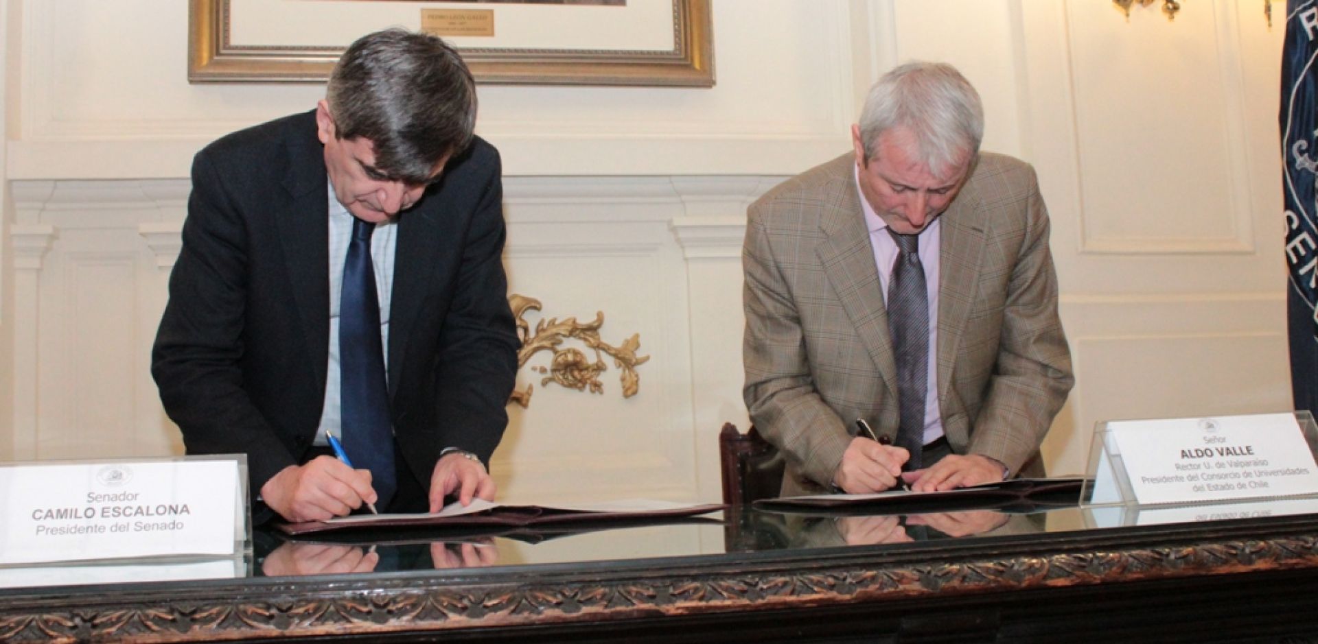 En una ceremonia realizada en el ex Congreso Nacional, se llevó a cabo este martes la firma del Convenio de Colaboración entre el Senado y el Consorcio de Universidades del Estado de Chile, cuyo fin consolidar la alianza entre TV Senado y UESTV para la transmisión de la producción audiovisual de las universidades estatales, y que exhibirá en su primera fase el programa UESTV-Noticias, informativo de las Universidades Estatales.