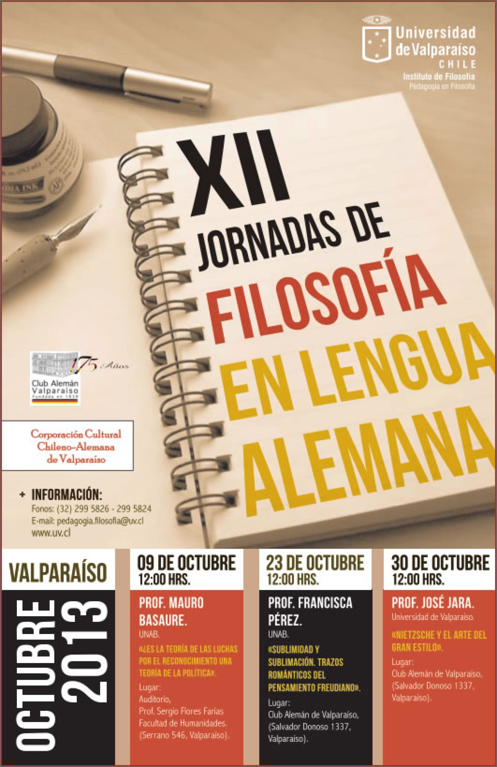 Desde hace doce años, el Instituto de Filosofía de la Facultad de Humanidades de la Universidad de Valparaíso junto al Club Alemán han desarrollado de manera conjuntas las Jornadas de Filosofía en Lengua Alemana, actividad que se convierte en la más importante dentro del calendario académico del instituto y que volverá a desarrollarse a partir del próximo miércoles 9 de octubre.