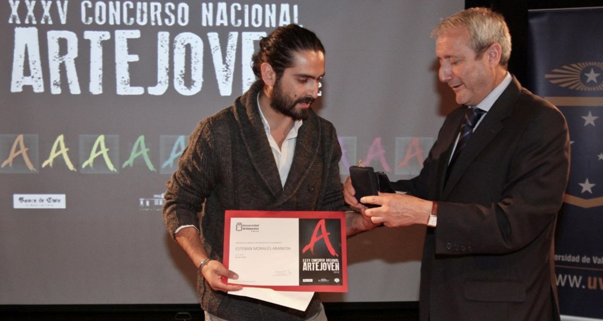 Mientras, el Premio Honor Universidad de Valparaíso fue para Esteban Morales, quien recibió de manos del rector Aldo Valle, una medalla, un diploma y cuatro millones de pesos. El artista santiaguino, quien presentó la obra “Fin en color”, perteneciente a la categoría pintura, recalcó el impulso que la casa de estudios da a los jóvenes artistas con este concurso.