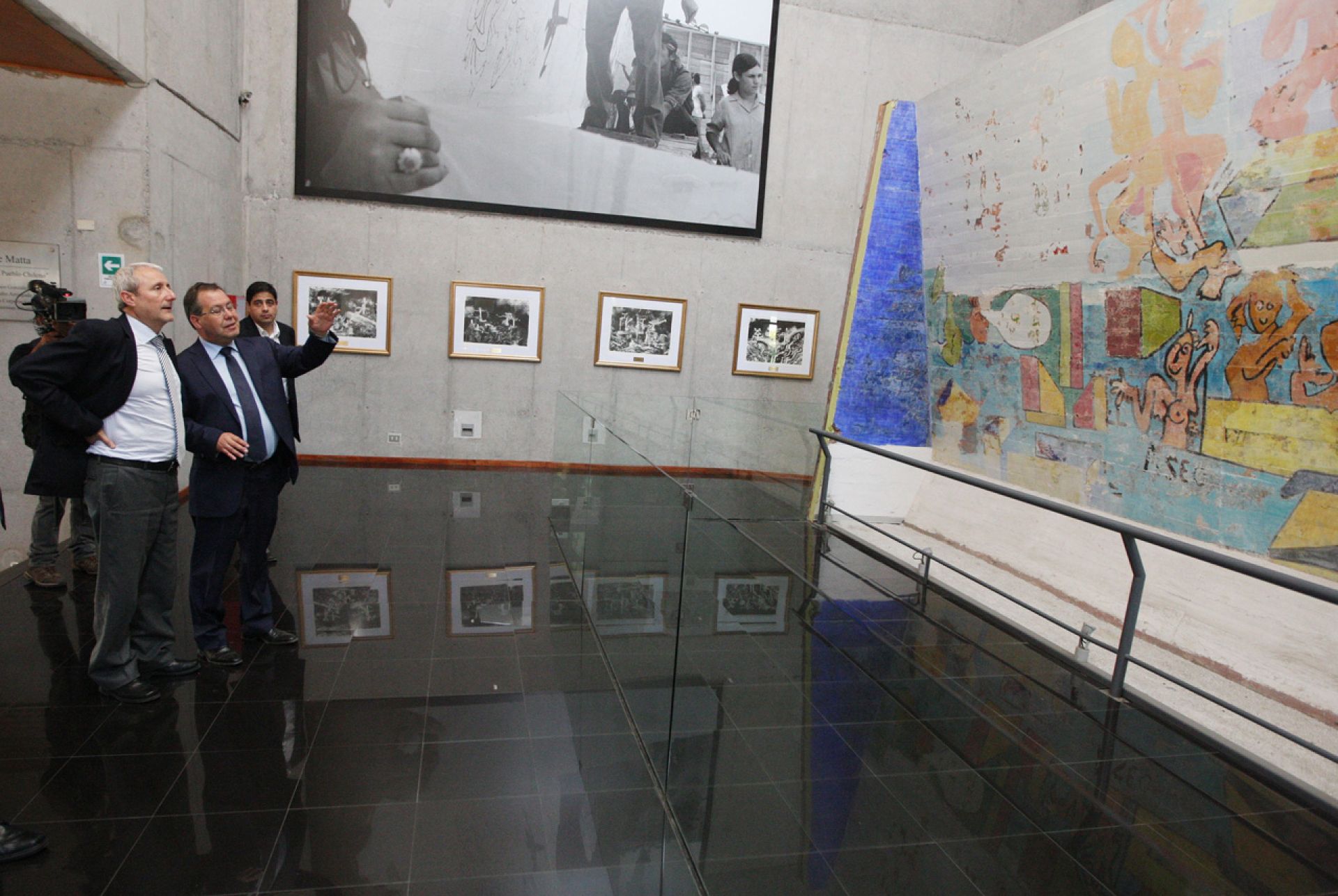 Tras la firma del convenio, el rector Valle fue invitado a conocer el Espacio Matta (vecino al edificio consistorial). La máxima autoridad de la UV asistió a la inauguración de la muestra “Desastre”, una exhibición de pinturas de artistas porteños alusivas al devastador incendio de abril pasado en Valparaíso. A continuación, el alcalde Delpín mostró al rector el famoso mural, pintado por Matta junto a la Brigada Ramona Parra en 1971 y le explicó detalladamente cómo este fue rescatado luego de haber sido pintado encima durante la dictadura.