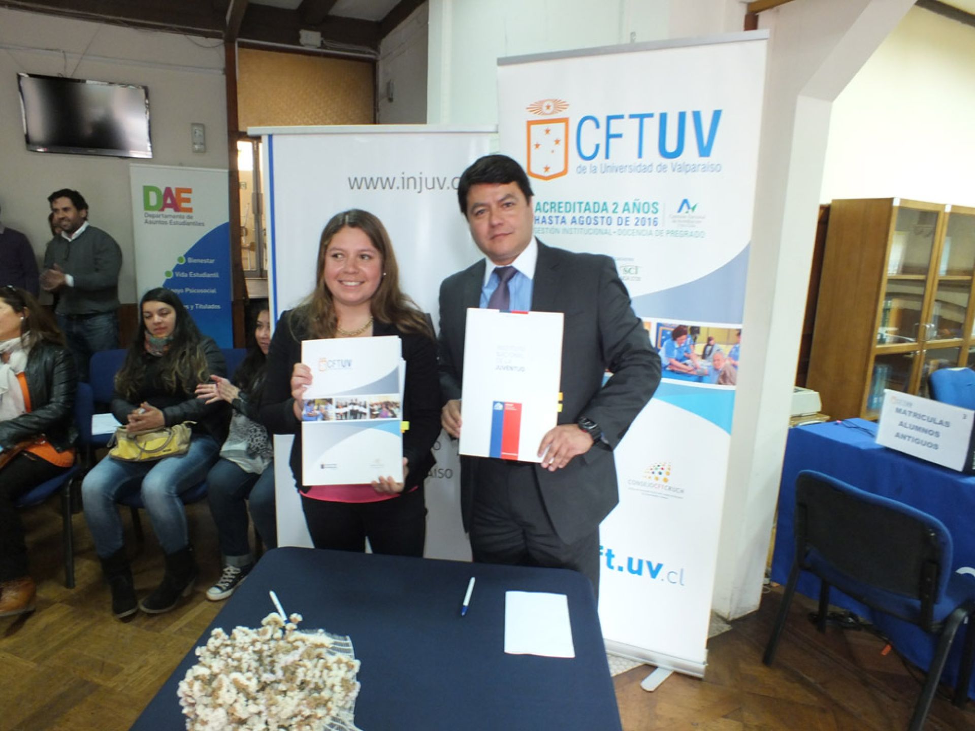 La ceremonia de suscripción del convenio se realizó en dependencias del CFT UV, en Viña del Mar, con la presencia de la directora regional de Injuv, Cristina Pavez, y el director del CFT, Luis Villarroel.