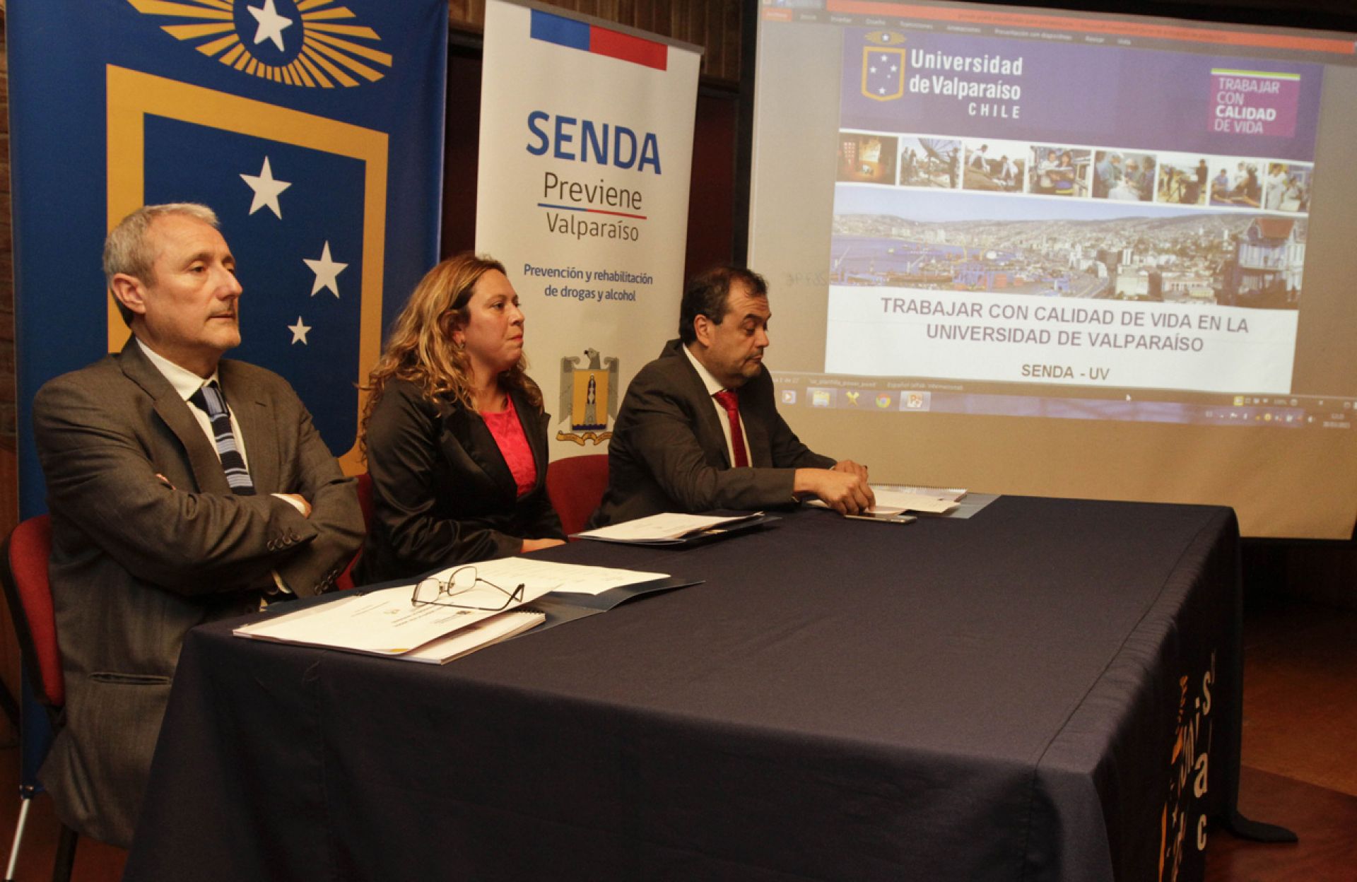 La ceremonia de firma fue presidida por al rector de la UV, Aldo Valle; la directora regional de Senda, Claudia Berríos, y el prorrector de la UV, Christian Corvalán.