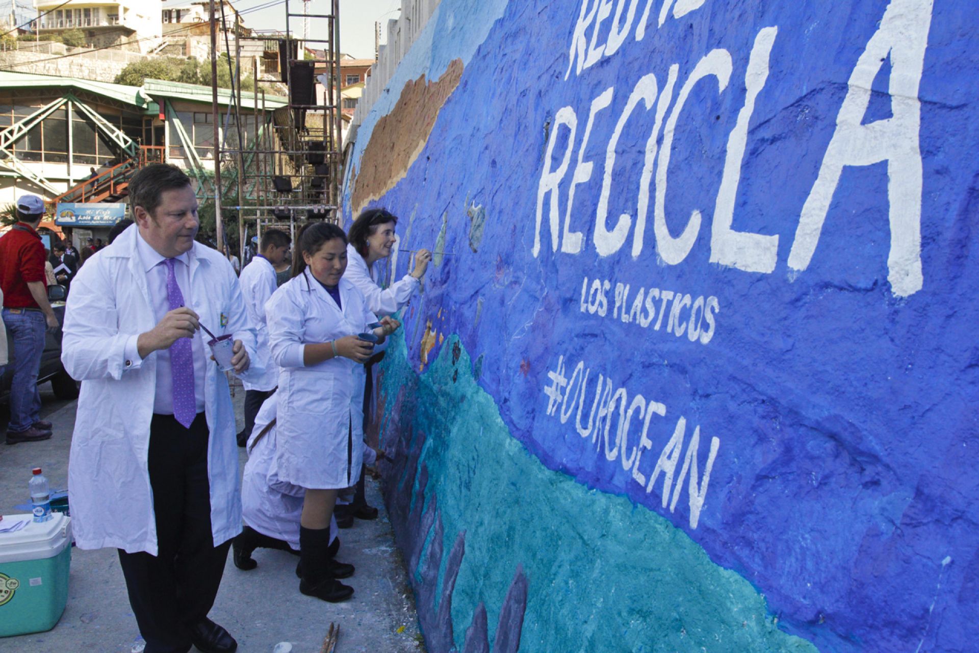 Por eso en el marco del Día de la Tierra y para preparar el camino a la II Conferencia Our Ocean, que se realizará el 5 y 6 de octubre de este año en la Región de Valparaíso, el embajador de Estados Unidos, Michael Hammer, junto a los alumnos del programa “Ciencia al tiro”, que dirige la neurobióloga doctora Kathleen Whitlock, del Centro Interdisciplinario de Neurociencia de la Universidad de Valparaíso, pintaron un gran mural en el sector de la Caleta El Membrillo.