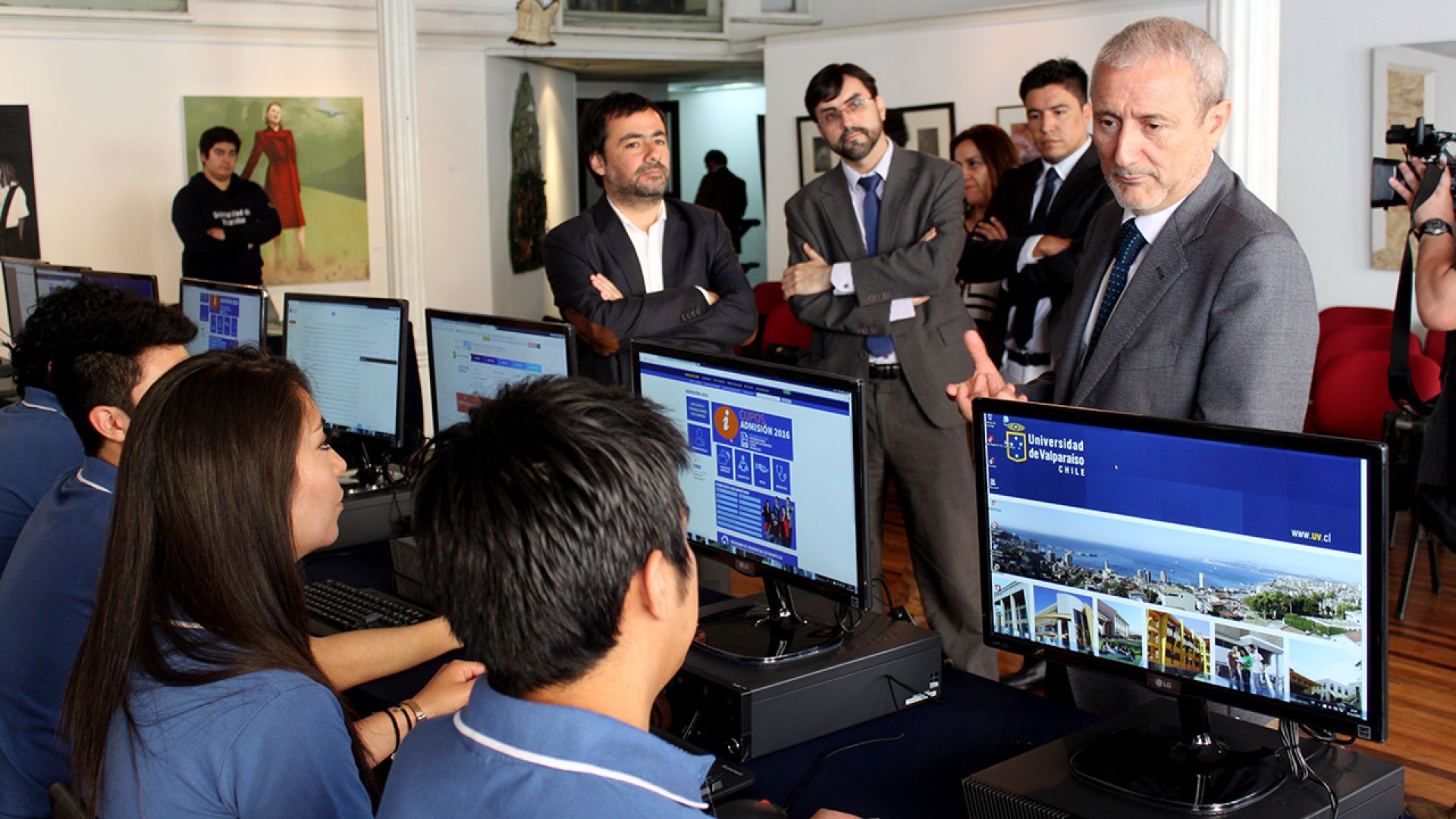 El rector Aldo Valle visitó el Centro de Apoyo a la Postulación e invitó a acercarse a quienes participarán del proceso de admisión 2016. “Los estudiantes que el próximo domingo, a las 8 de la mañana, van a conocer sus resultados en las Pruebas de Selección Universitaria podrán, a partir de las 9 horas de ese mismo día, iniciar las postulaciones a las distintas carreras y universidades a que quieran optar. Es necesario, en consecuencia, disponer de información adicional, y con ese propósito, la Universidad de Valparaíso tendrá aquí, en pleno centro de Valparaíso, un Centro de Apoyo, en que los estudiantes podrán simular las posibilidades que tienen de quedar seleccionados en las carreras a que ellos quieran optar”.