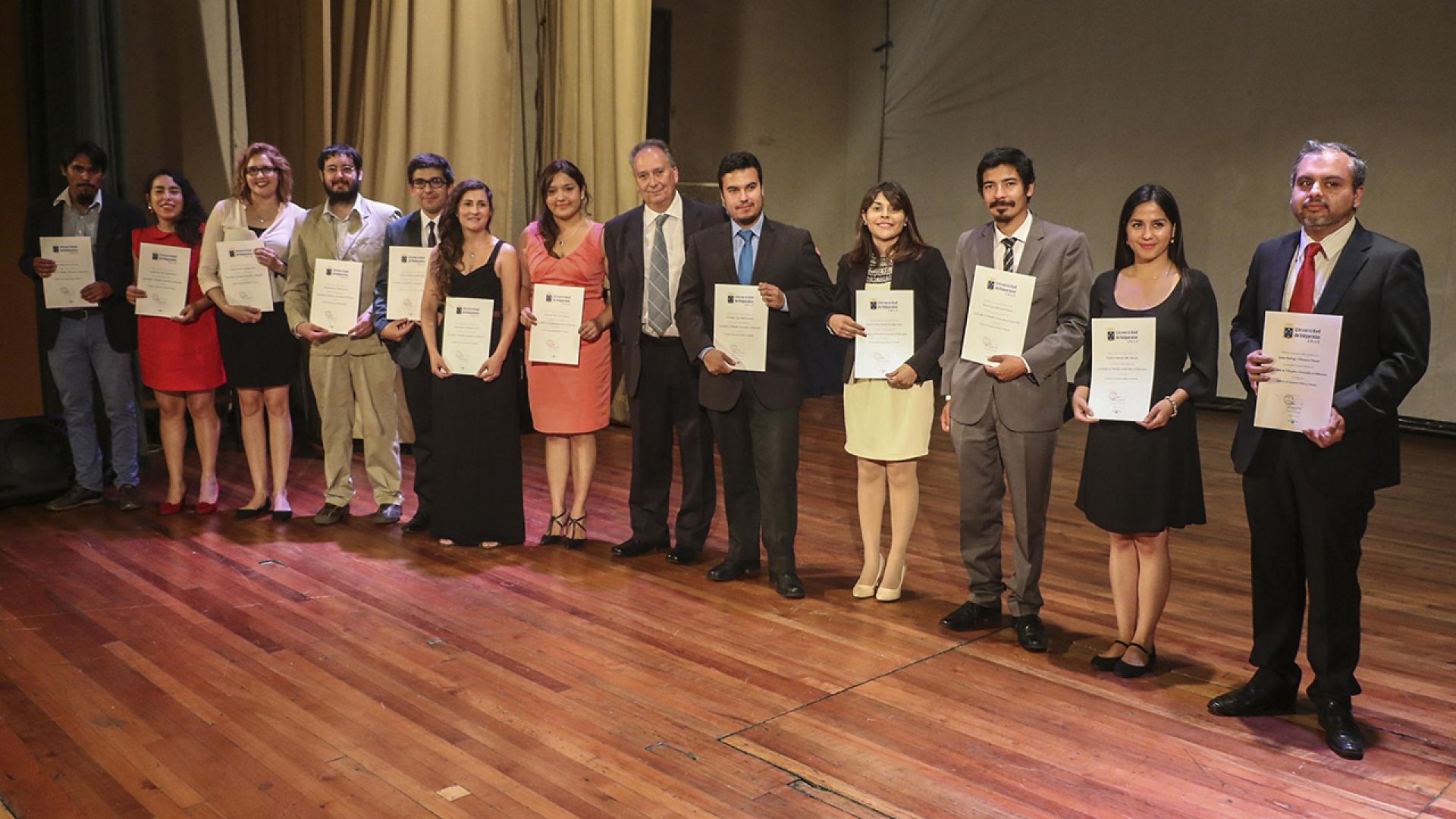 Luego, se procedió a la entrega de diplomas, de acuerdo al siguiente orden: carrera de Pedagogía en Historia y Ciencias Sociales, título profesional de profesor de Enseñanza Media en Historia y Ciencias Sociales, licenciado en Historia y Ciencias Sociales y Licenciado en Educación, promociones 2013, 2014 y 2015; carrera de Pedagogía en Filosofía, título profesional de profesor de Enseñanza Media en Filosofía, licenciado en Filosofía y licenciado en Educación, promociones 2013, 2014 y 2015; carrera de Música, licenciado en Arte, Tecnología y Gestión Musical, promociones 2013, 2014 y 2015; y carrera de Sociología, título profesional de sociólogo, licenciado Sociología. Los diplomas fueron entregados por los directores de carrera: Patricio Gutiérrez, Walter Díaz, Pablo Palacios y Luis Henríquez, respectivamente.