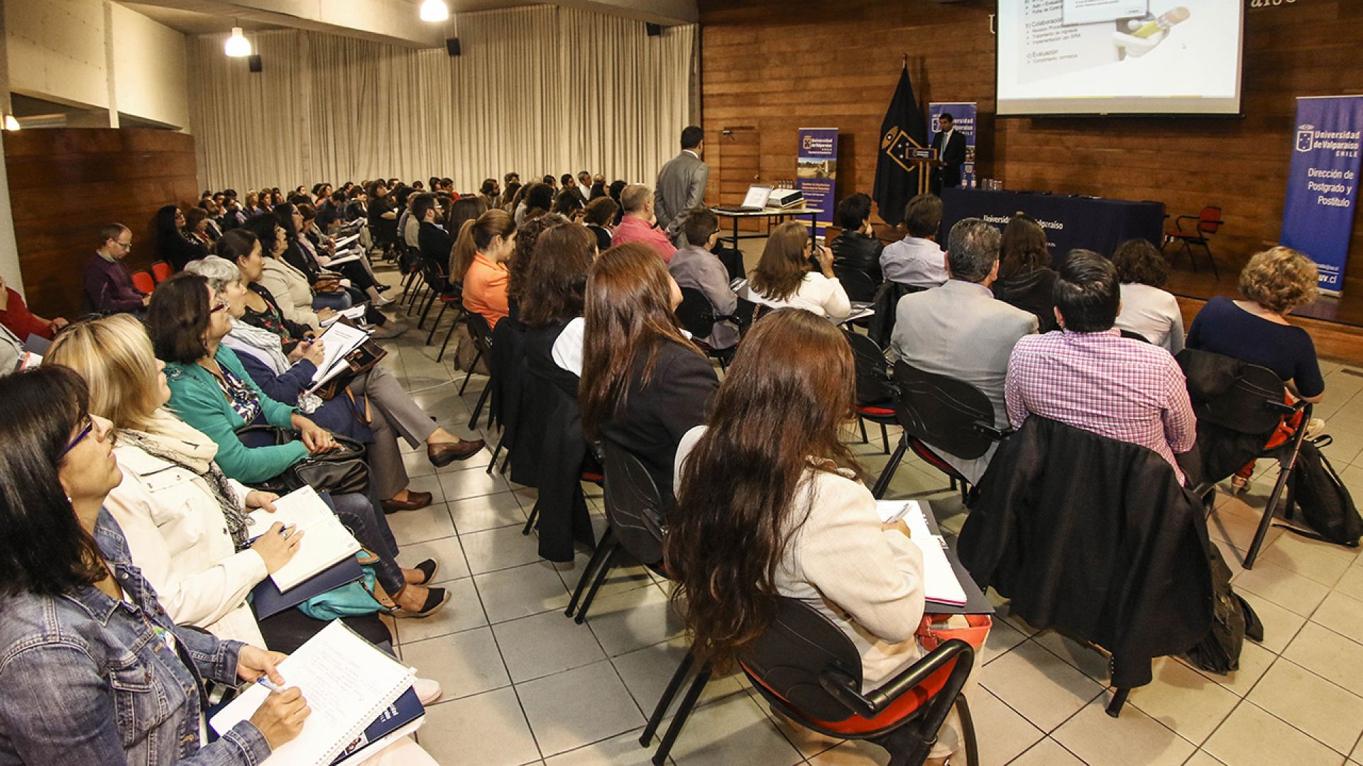 En el auditorio de la Facultad de Arquitectura se desarrolló el seminario “Gestión administrativa y académica de Postgrados UV”. La actividad fue organizada por la Dirección de Postgrado y Postítulo, con la colaboración de Prorrectoría y la Contraloría Interna. El objetivo del encuentro fue contribuir a una mejor gestión de los programas y a disminuir los riesgos asociados.