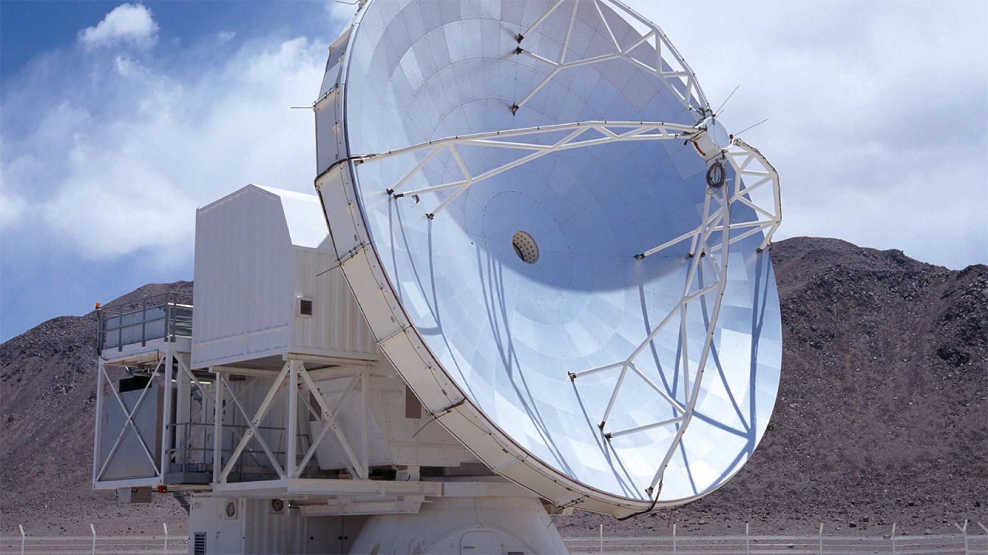El telescopio APEX, operado por la ESO, se ubica a 5 mil 100 metros de altura, en el llano de Chajnantor, en la Región de Atacama. Tiene 12 metros de diámetro y opera a longitudes de onda milimétrica y submilimétricas, entre luz infrarroja y ondas de radio.