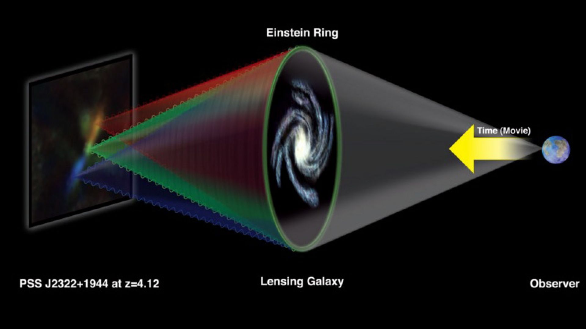 “Esta teoría generaliza la ley de la gravedad de Newton, introduciendo la idea de que la fuerza de gravedad curva el espacio-tiempo. Una de las predicciones de Einstein es que los objetos celestes pueden curvar los rayos de luz, produciendo espejismos cósmicos (lo que hoy conocemos como lente gravitatorio)”.