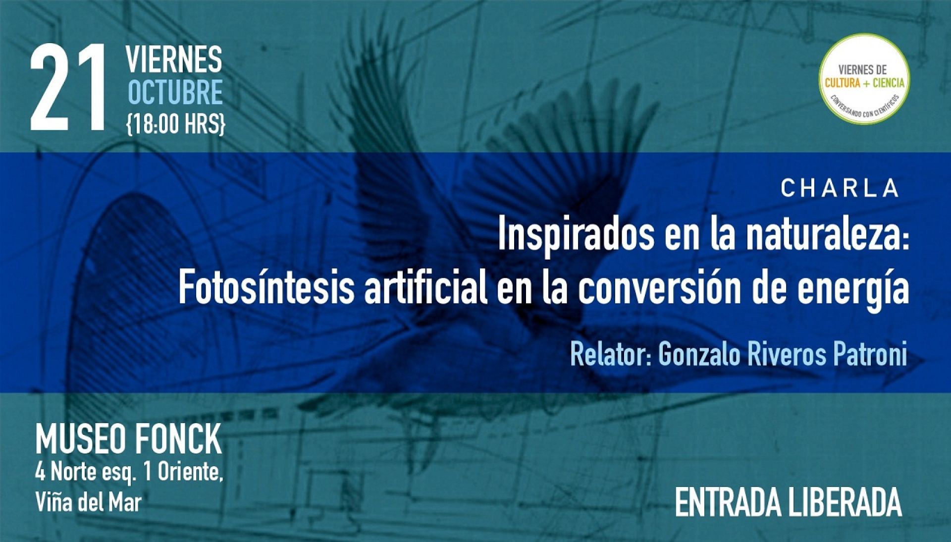 Viernes de Cultura + Ciencia es un iniciativa conjunta del Proyecto Asociativo Regional, PAR Explora de CONICYT Valparaíso y el Museo Fonck de Viña del Mar. Este espacio invita semanalmente a la comunidad a conocer el impacto de la ciencia en un diálogo directo la comunidad científica. El espacio cuenta con la participación de académicos e investigadores de la Universidad de Valparaíso, la UPLA, la UTFSM y la PUCV.