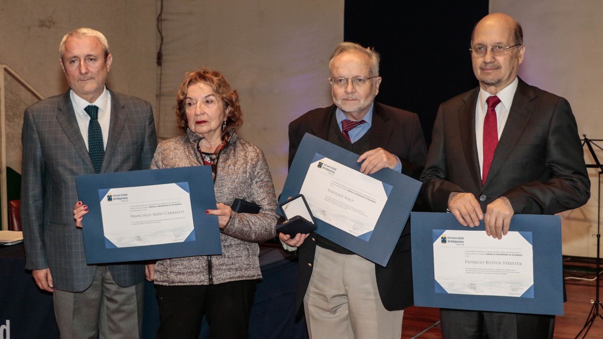 La Medalla UV fue otorgada este año a Patricio Bustos, por su labor en defensa de los Derechos Humanos mientras fue director del Servicio Médico Legal; a Nikolaus Vogt, académico e investigador de la UV, por su aporte en la difusión y el conocimiento de la astronomía, y, de manera póstuma, a Francisco Aedo, académico de la Facultad de Arquitectura, detenido desaparecido desde diciembre de 1974. En representación del profesor Aedo recibió la distinción su hija Paulina Aedo Alarcón.