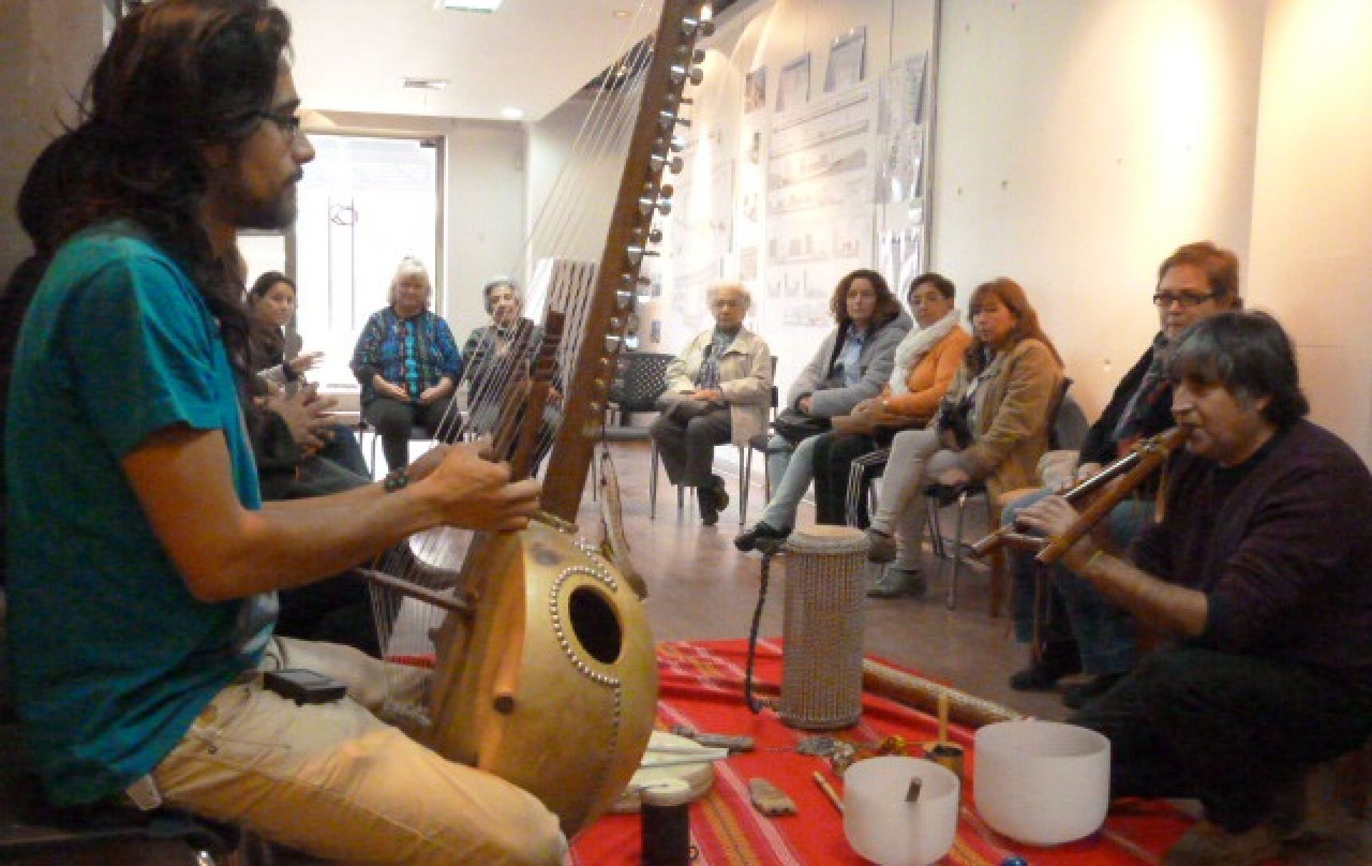 El taller estuvo a cargo del académico de la Escuela de Educación Parvularia UV y especialista en psicoterapia de la Gestalt Enzo Arias y del docente y músico Juan Pablo Aisa, quienes interpretaron una serie de poco conocidos instrumentos ancestrales -y otros de creación más moderna- pertenecientes a diferentes culturas y países, al tiempo que intercambiaron ideas y pareceres con los asistentes.