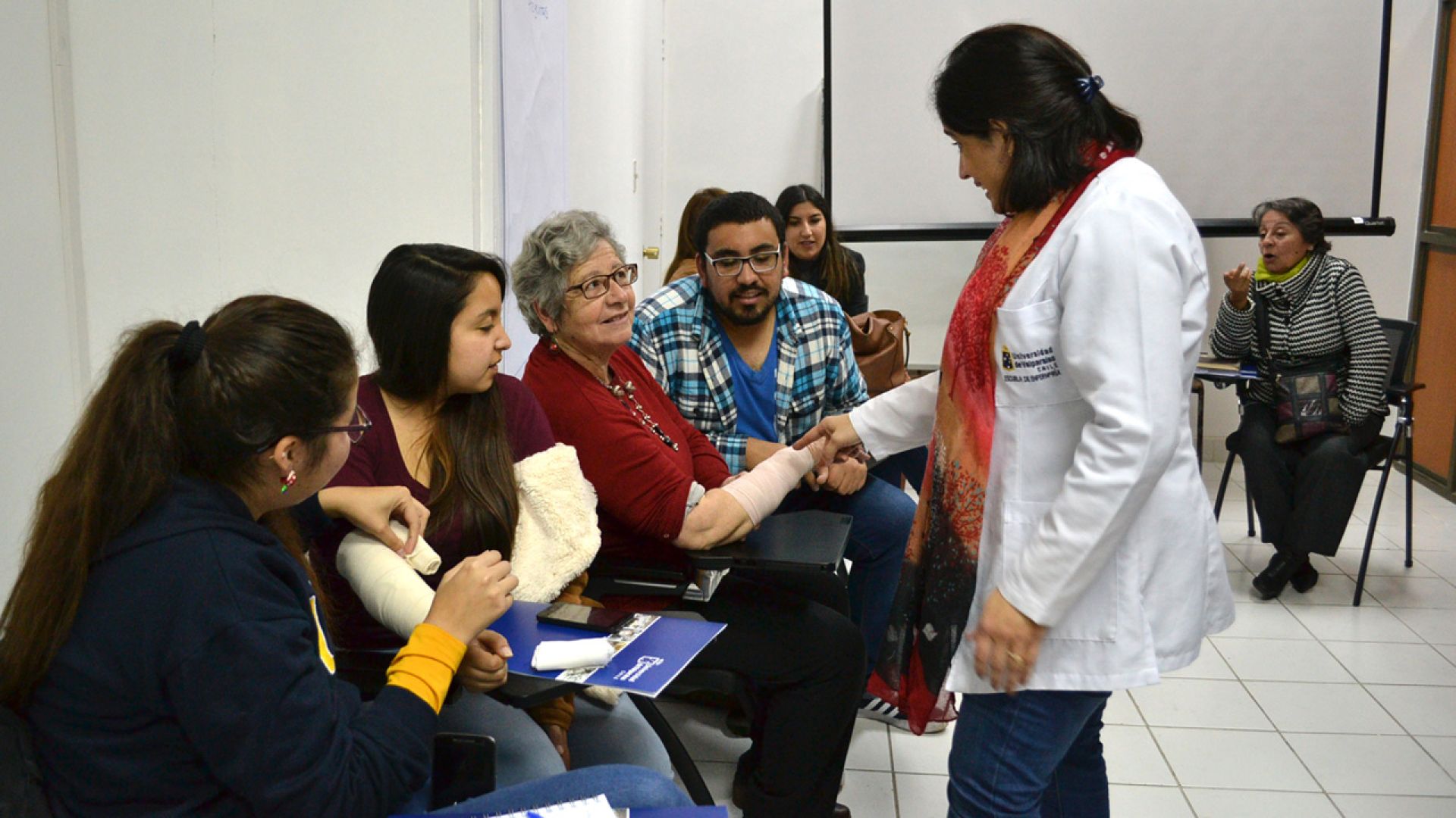La académica y coordinadora de Extensión y Vínculos de la Escuela de Enfermería, Andrea Melo, señaló que este espacio de formación permite acercar la universidad al ámbito comunitario, entregando contenidos y aprendiendo de las experiencias de los distintos actores sociales. Además, la docente explicó el motivo de incluir nuevas materias relacionadas a los primeros auxilios en niños: “Surgió la inquietud de incorporar contenidos del área infantil porque muchas veces los adultos mayores se dedican al cuidado de sus nietos”, precisó.