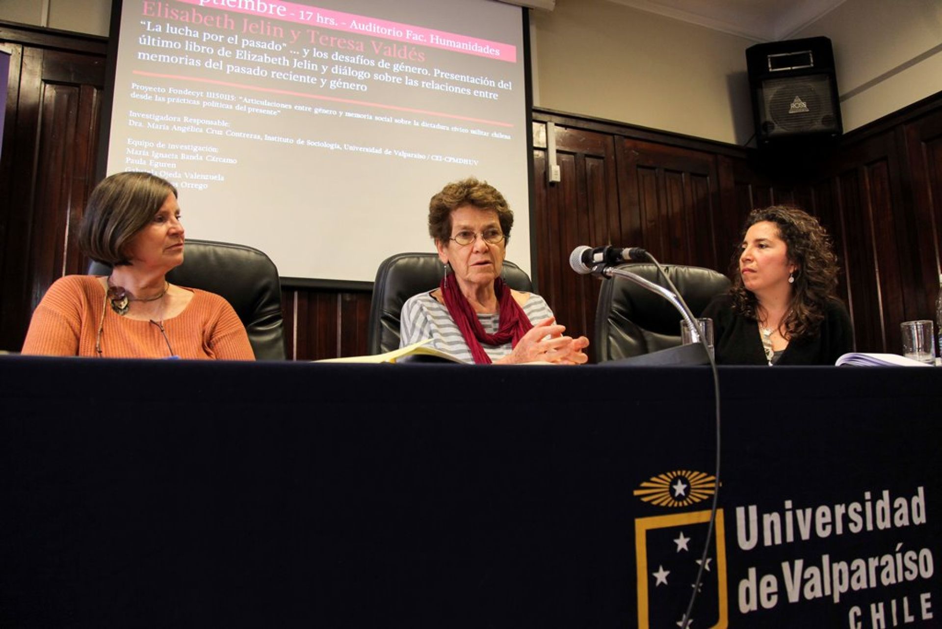 Junto a ella, compartieron el panel la socióloga chilena Teresa Valdés, investigadora en temas de género, y la socióloga María Angélica Cruz, académica de la UV, profesora a cargo del proyecto Fondecyt 11160115, entidad a cargo de la organización del evento junto al Centro de Estudios Interdisciplinarios sobre Cultura Política, Memoria y Derechos Humanos (CEI-CPMDH).