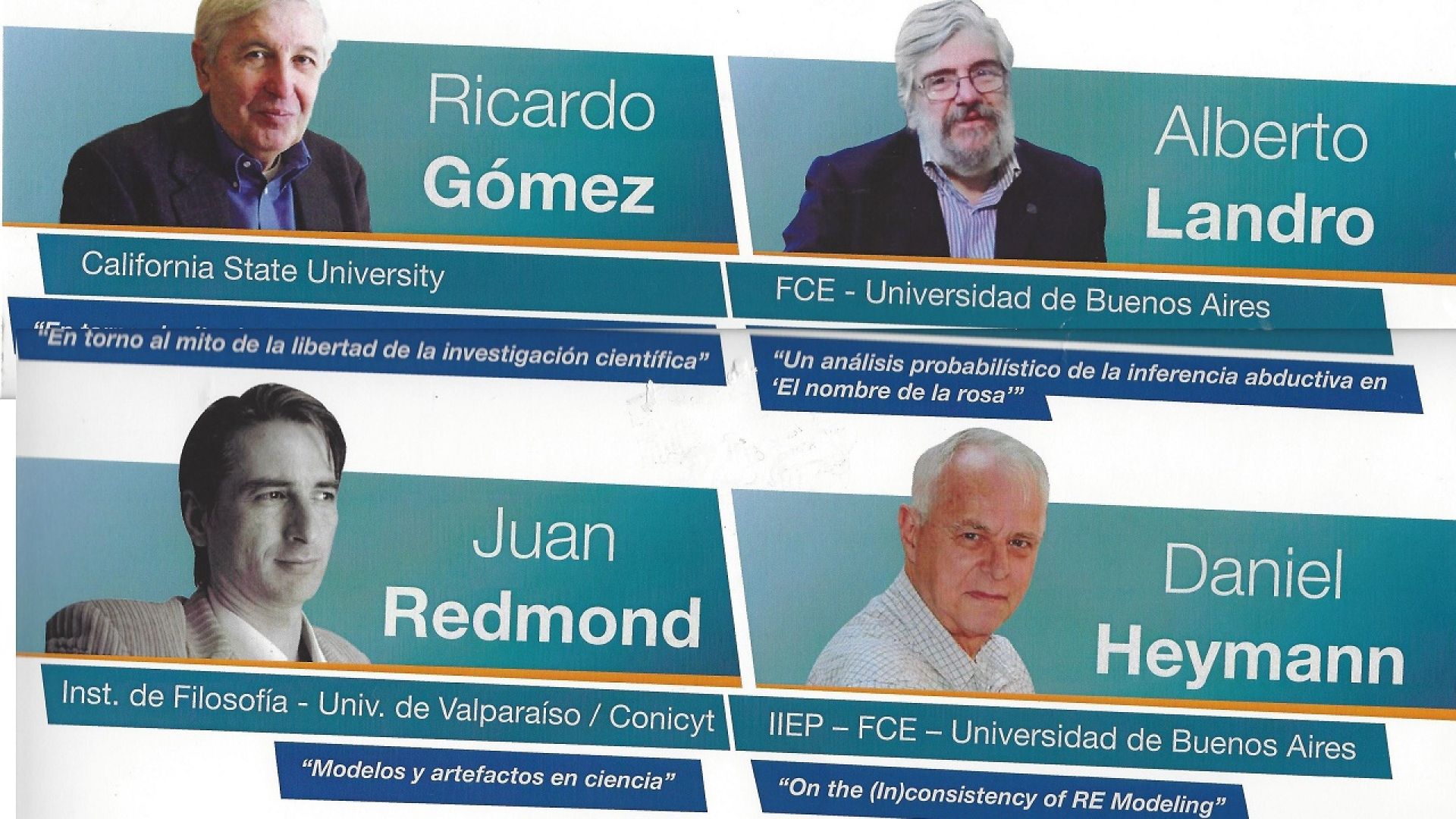 Respecto de la ponencia que presentó, “Modelos y artefactos en ciencias”, Juan Redmond apunta que “trabajo desde hace unos buenos años en la relación entre ficciones y conocimiento. En particular con ficciones literarias, es decir, hasta qué punto las ficciones hacen parte de las prácticas científicas o filosóficas. Dicho de otro modo, qué podemos aprender de las ficciones literarias para entender mejor cómo se desarrollan y se ganan nuevos conocimientos. El tema de argumentar con ficciones lo trabajé bastante desde el enfoque del pragmatismo dialógico (teoría de juegos), incluso desarrollé una de las primeras lógicas dialógicas dinámicas sobre ficciones. Pero ahora mi trabajo se orienta hacia los procesos de modelización en ciencia, que es posible estudiar desde una perspectiva ficcional y que tienen en la economía uno de sus lugares preferidos”.