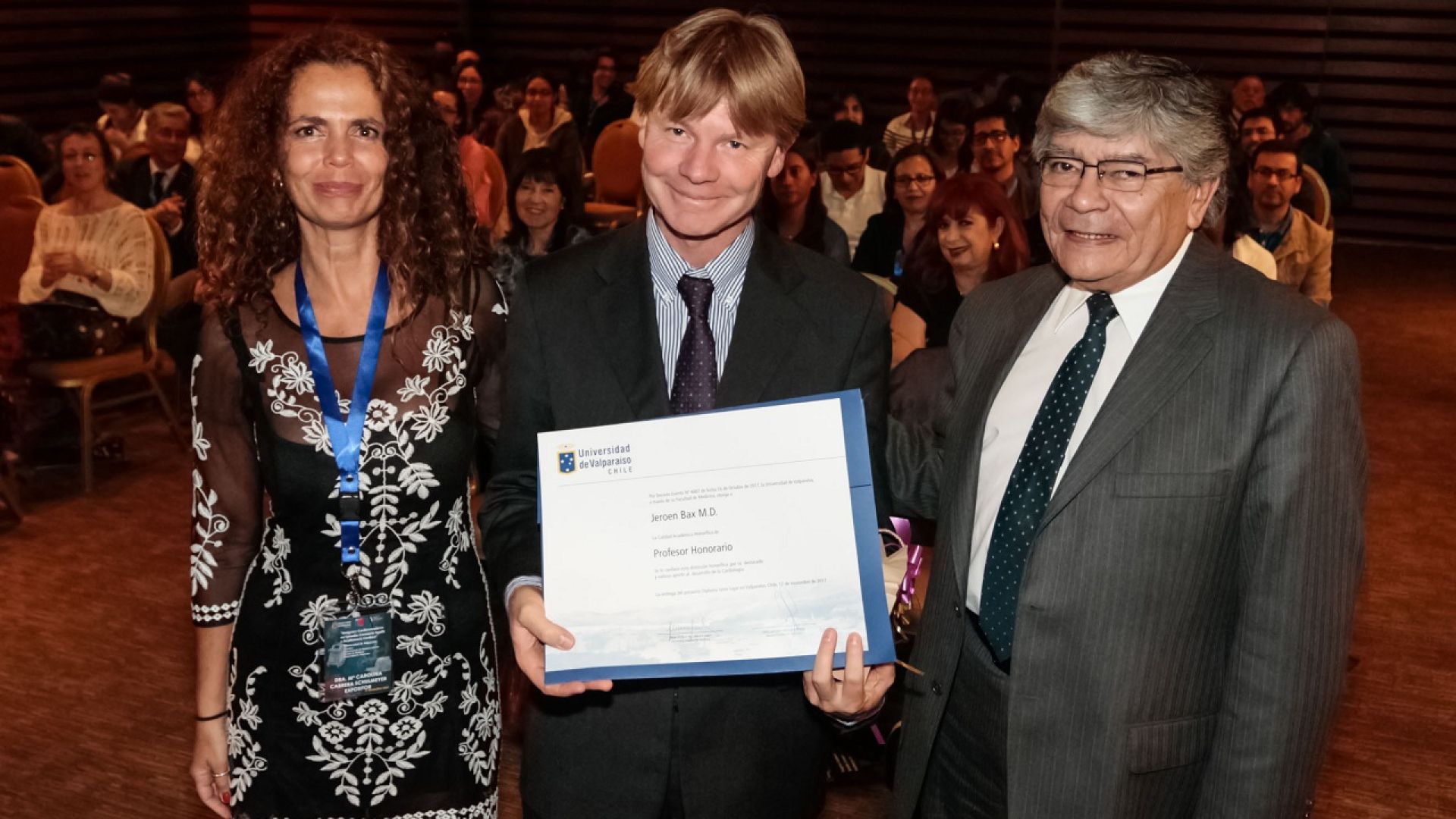 Durante el simposio, los médicos Jeroen Bax y Petros Nihoyannpoulos recibieron el grado académico de Profesor Honorario de la Universidad de Valparaíso, reconocimiento otorgado por el decano de la Facultad de Medicina, Antonio Orellana.