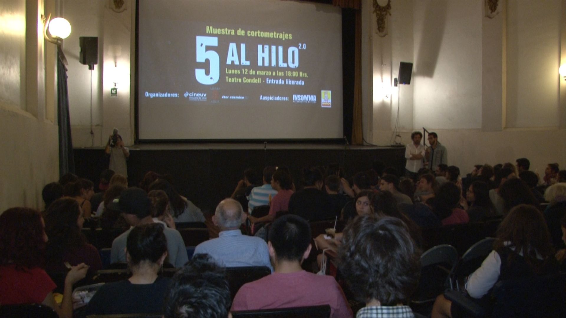 “5 al hilo” fue el nombre de la muestra de cortometrajes organizada por las productoras Lluvia Ácida y Éter Cósmico, integradas por exalumnos de la Escuela de Cine de la Universidad de Valparaíso, que se realizó en el Teatro Condell, congregando una gran cantidad de público.
