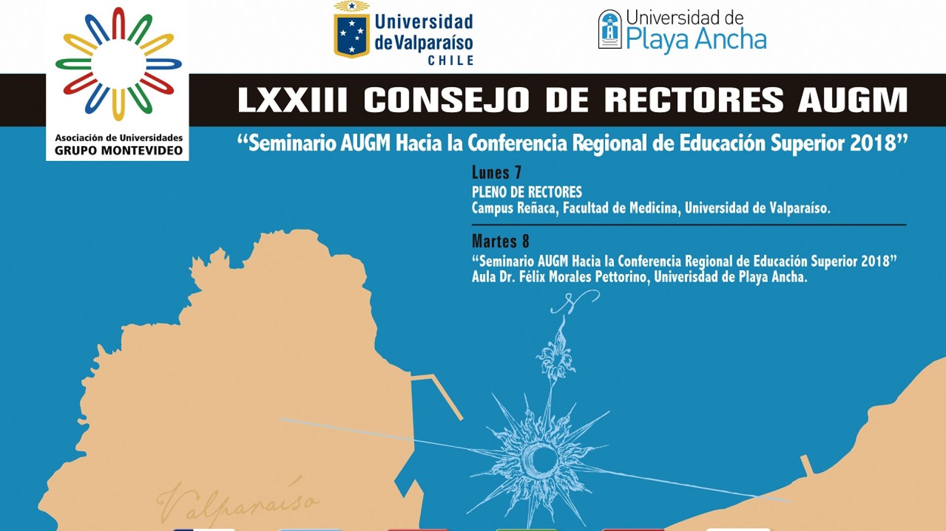 Treinta y tres delegaciones de instituciones de educación superior estatales pertenecientes a la Asociación de Universidades Grupo Montevideo (AUGM) se reunirán este lunes y martes en Viña del Mar y Valparaíso para celebrar el LXXIII Consejo de Rectores y un seminario de difusión. La actividad es organizada en conjunto por la Universidad de Playa Ancha y la Universidad de Valparaíso.