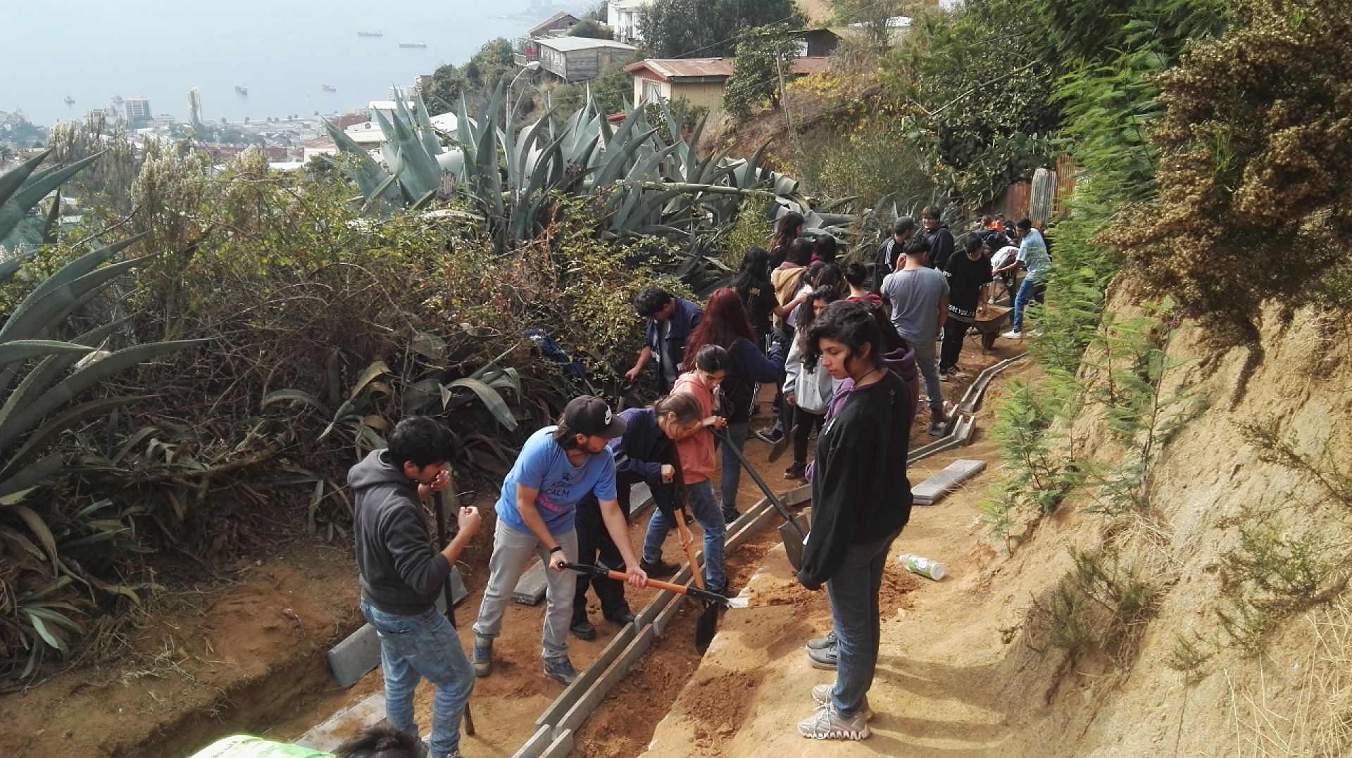 La instalación de ciento cuarenta metros lineales de solerillas y canales de agua, excavaciones, retiro de excedente y nivelación son algunos de los trabajos con los que comenzó la construcción de un sendero inclusivo que un grupo de alumnas de la Escuela de Arquitectura UV está desarrollando en la toma Pasaje Lorena, del cerro Jiménez de Valparaíso.