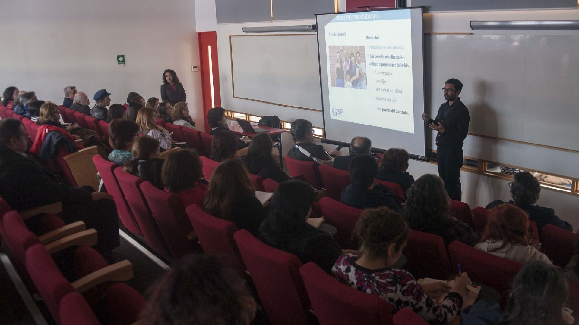 Las presentaciones estuvieron a cargo de los asesores de la Superintendencia de Pensiones Omar Quevedo y Mónica Villalobos, quienes abordaron temáticas como beneficios previsionales, modalidades de pensión, documentación requerida, bono por hijo, asesores previsionales, pilar solidario y garantía estatal, entre otros aspectos de interés.