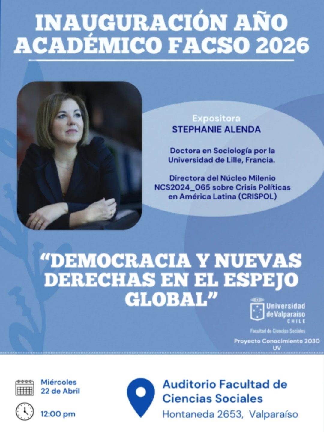¡Tenemos el agrado de invitarles a la ceremonia de inauguración del año académico en la Facultad de Ciencias Sociales! Se desarrollará este próximo miércoles 22 de abril a las 12:00 Hrs. en nuestro Auditorio y contaremos con la participación de la destacada socióloga Stephanie Alenda, actual directora del Núcleo Milenio Sobre Crisis Políticas (CRISPOL).