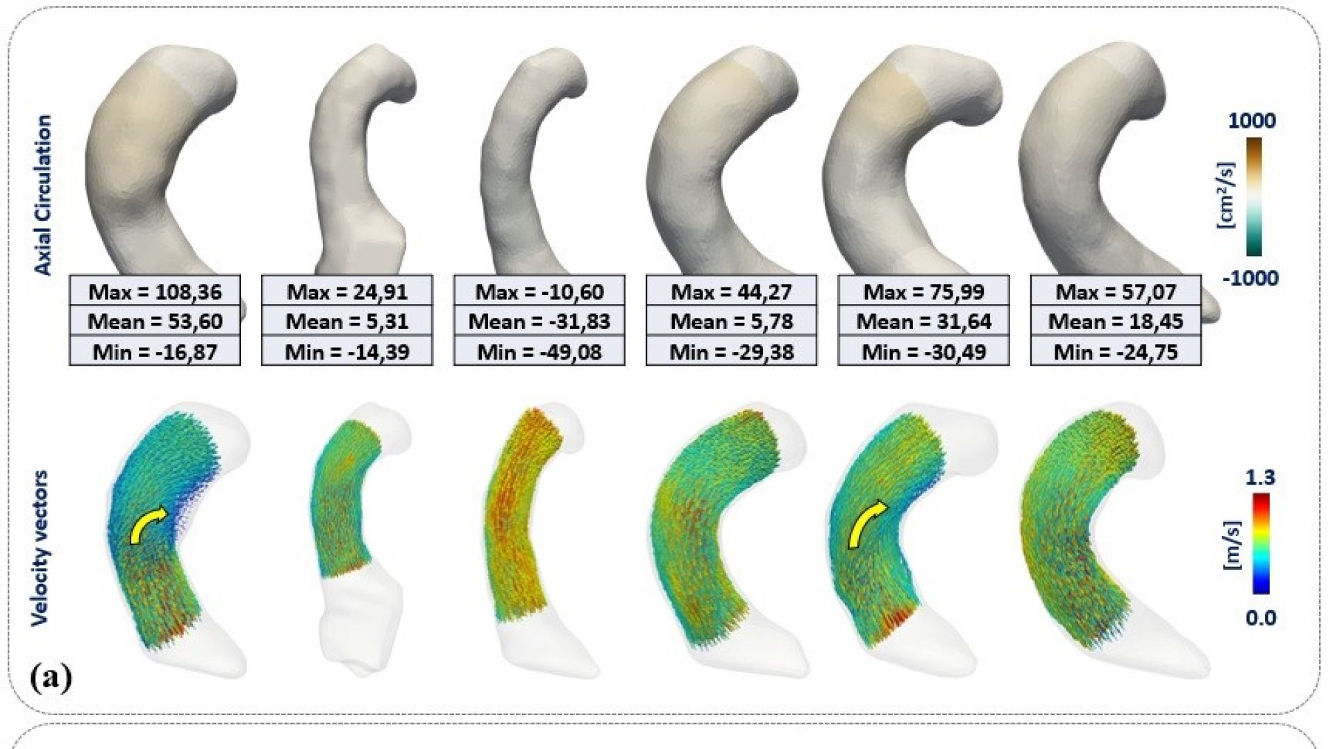 “En la sección A se muestran los resultados obtenidos en seis voluntarios sanos, en que el flujo de sangre es más bien laminar y no se generan flujos helicoidales, por lo que los valores de circulación son bajos, y en la sección B se muestran los resultados obtenidos en pacientes con válvula aortica bicúspide. Estos pacientes se caracterizan por poseer un flujo helicoidal en la aorta ascendente, lo que se traduce en un remodelamiento vascular progresivo que dilata la aorta ascendente, este segmento de la aorta es reemplazado cuando el diámetro supera un cierto límite”, explica.