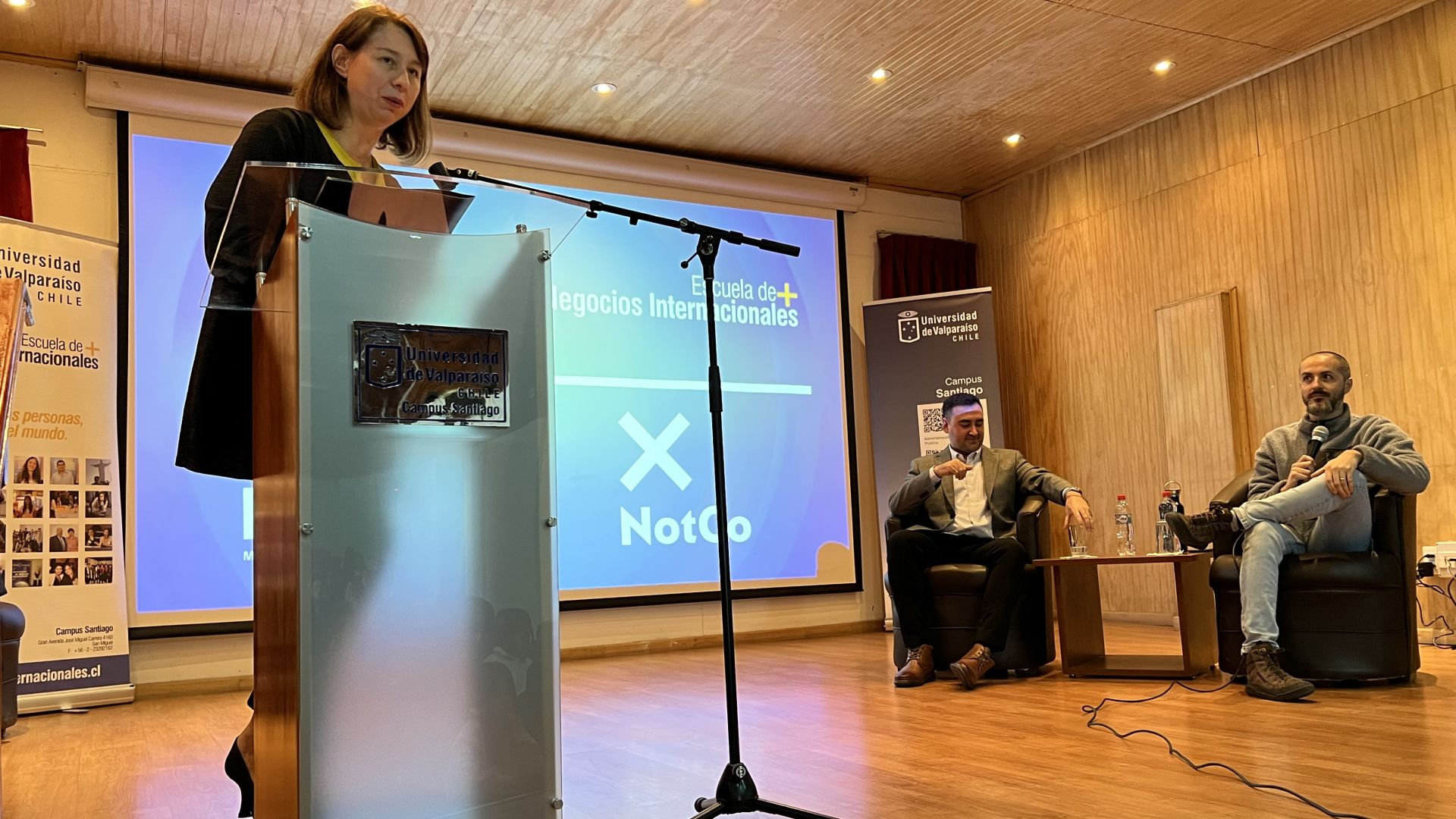 Este seminario, que se realizó en el teatro del recinto de San Miguel, fue organizado por la Escuela de Negocios Internacionales y el Campus Santiago de la Universidad de Valparaíso. La jefa de carrera, Daniella de Luca, condujo esta actividad orientada especialmente a estudiantes.