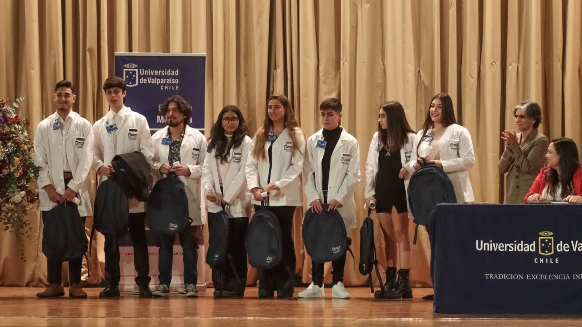Setenta y nueve estudiantes de primer año de la Escuela de Medicina de la Universidad de Valparaíso (casa central) fueron investidos con el tradicional delantal blanco y la piocha institucional que los identifica como futuros médicos de la UV.