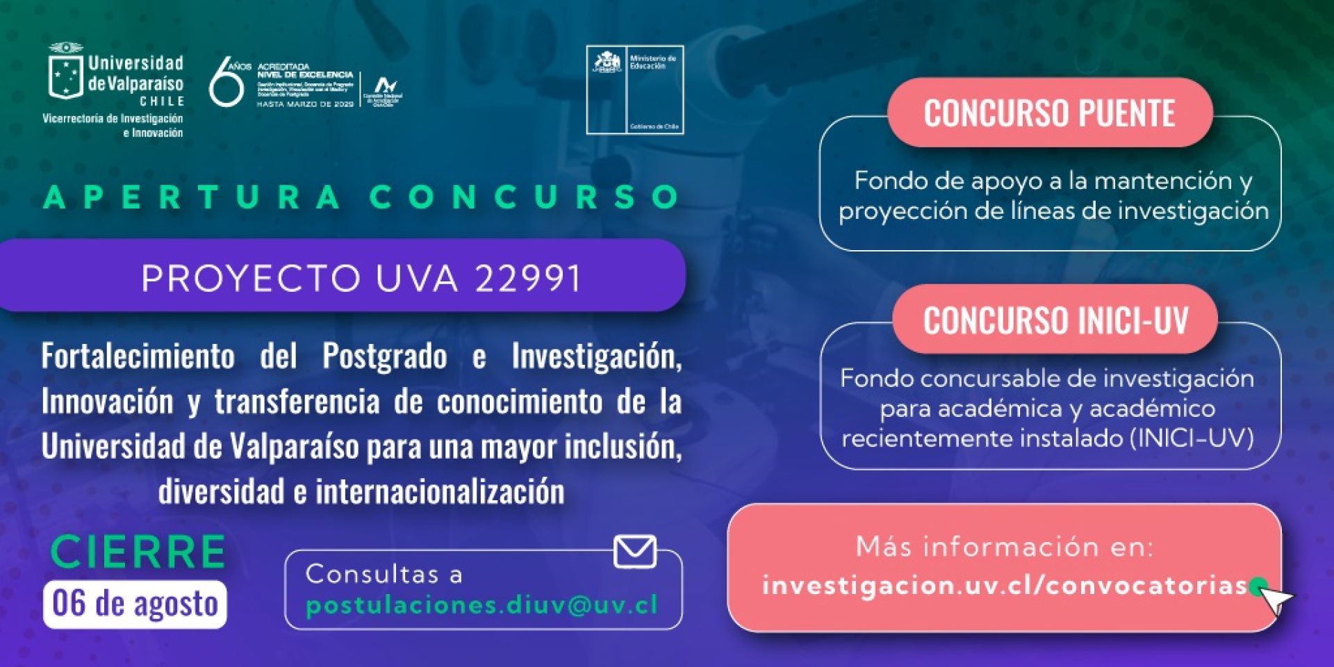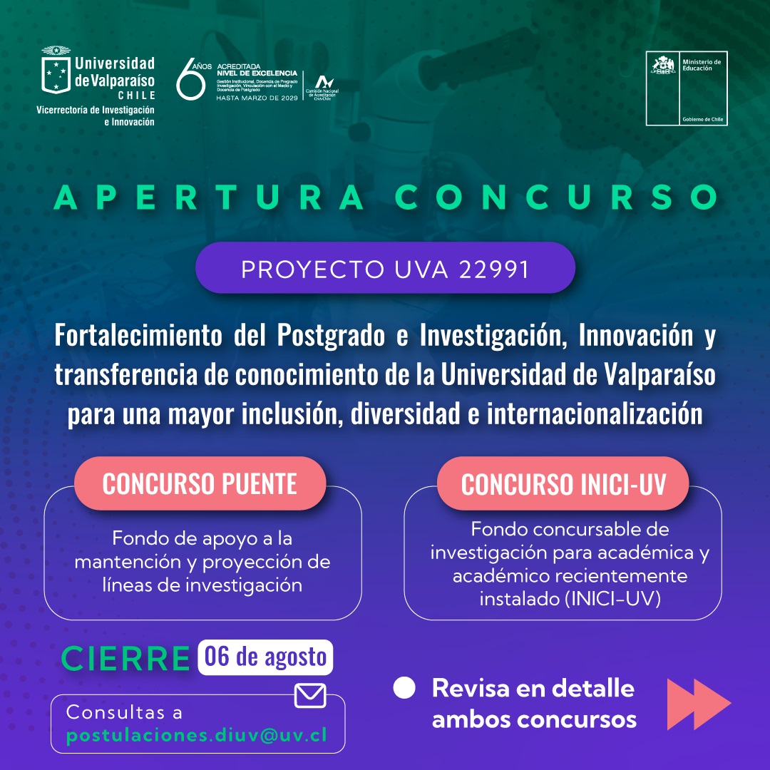 La Vicerrectoría de Investigación e Innovación de la Universidad de Valparaíso, a través de la Dirección de Investigación (DIUV) invita a investigadoras e investigadores a presentar sus propuestas en los nuevos concursos internos impulsados por el Proyecto Institucional UVA 22991, financiado por el Ministerio de Educación.
