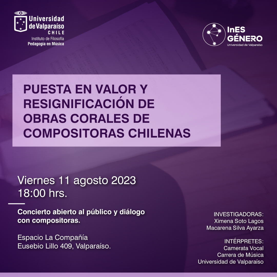 Explica Ximena Soto, responsable del proyecto: “El estudio se centra sobre la figura de la mujer como creadora musical en Chile, dado que en la escasa bibliografía y fuentes documentales que existen, se evidencia una profunda invisibilización de esta como sujeto de creación. Frente a esta realidad, nuestra investigación aborda documentar, analizar e interpretar obras corales de las compositoras Sylvia Soublette, Leni Alexander, Natalie Recabarren, Javiera Campos, Priscila Vergara, Ximena Soto y Valeria Valle, como una forma de poner en valor y resignificar desde el uso y puesta en circulación de la creación femenina en el ámbito musical chileno universitario”.