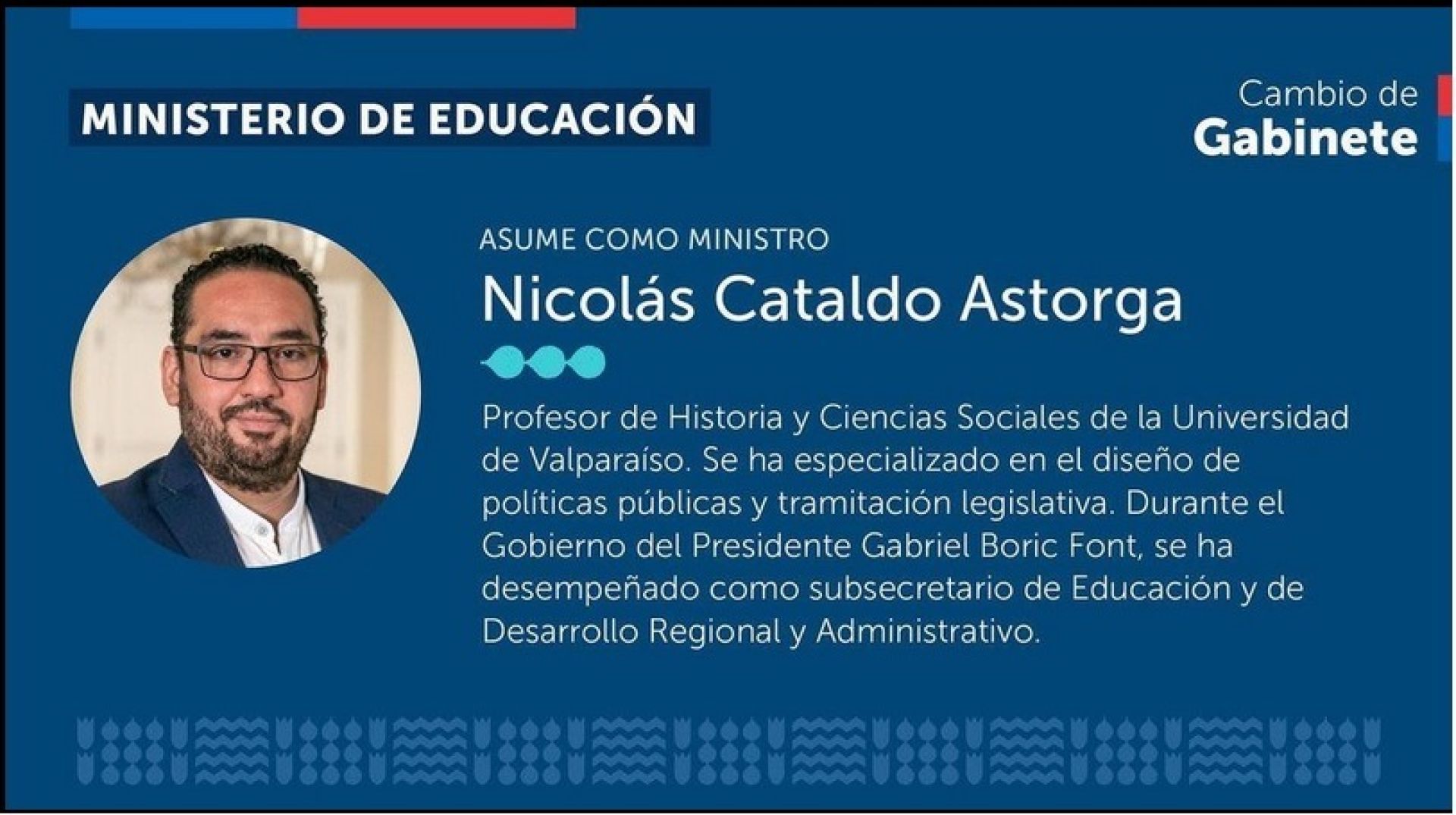 Nicolás Cataldo sucede en el cargo a Marco Antonio Ávila. El nuevo ministro, militante del Partido Comunista, fue entre 2010 y 2013 asesor técnico del Departamento de Educación y Perfeccionamiento del Colegio de Profesores de Chile A.G. Asimismo, también formó parte del equipo editorial de la Revista Docencia. En 2013 fue asesor legislativo en Educación de la bancada de diputados del PC, mientras en 2014 asumió como jefe de gabinete y asesor legislativo en educación de la entonces diputada Camila Vallejo.