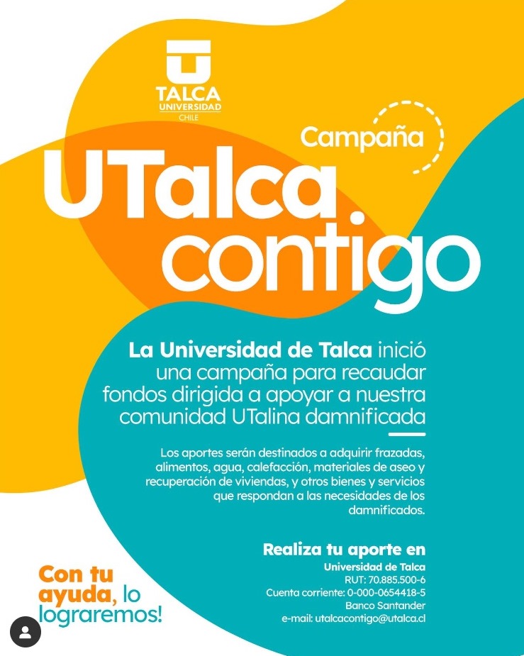 Ante este panorama, la Universidad de Talca realiza esta campaña solidaria, invitando a todas las personas a aportar fondos, lo que se puede hacer depositando en la Cuenta Rut 70.885.500-6 de la Universidad de Talca, o la cuenta corriente 0-000-0654418-5 del Banco Santander. El correo electrónico correspondiente es