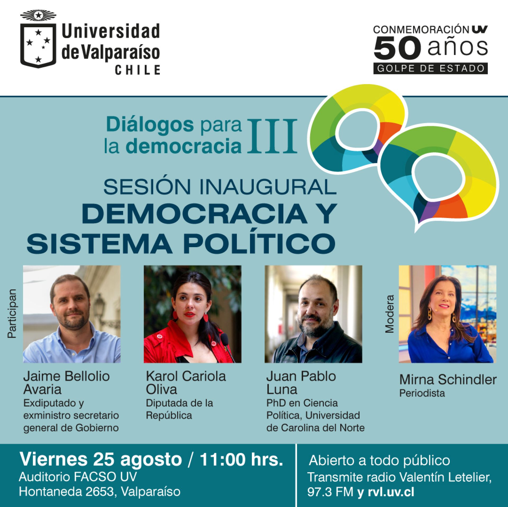 En la sesión inaugural, titulada Democracia y Sistema Político, participarán como expositores el exdiputado y exministro secretario general de Gobierno, Jaime Bellolio; la diputada de la República Carol Cariola, y el doctor en Ciencia Política de la Universidad de Carolina del Norte (Estados Unidos), Juan Pablo Luna. Como moderadora intervendrá la periodista Mirna Schindler.