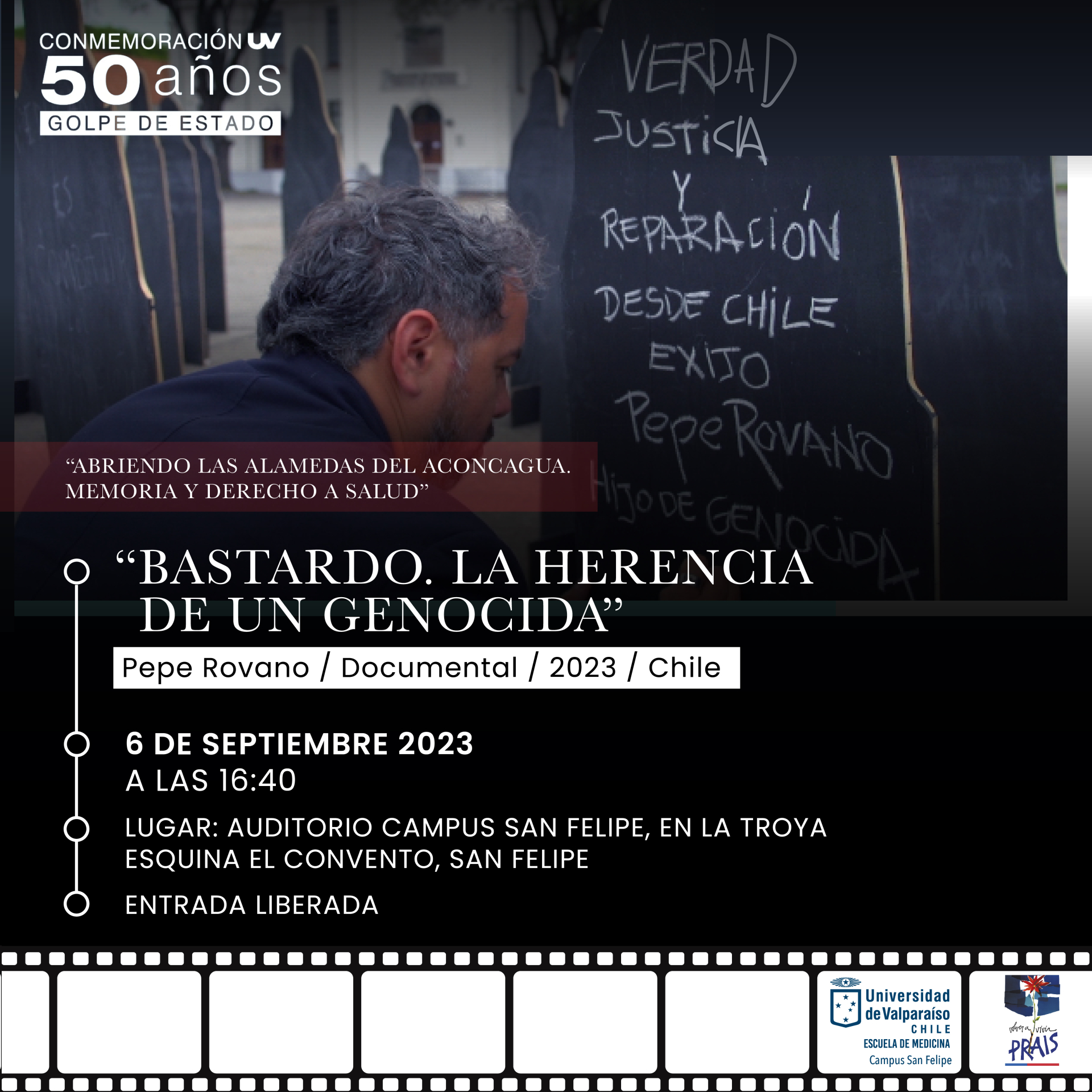 El programa, que se llevará a cabo en el Campus San Felipe de la Universidad de Valparaíso, contempla para el día miércoles 6 de septiembre la presentación del documental “Bastardo, la herencia de un genocida” (2023, Chile) y posterior conversatorio con el director Pepe Rovano y una experiencia interactiva con visores 3D “Lugares de memoria: Las Rocas de Santo Domingo”.
