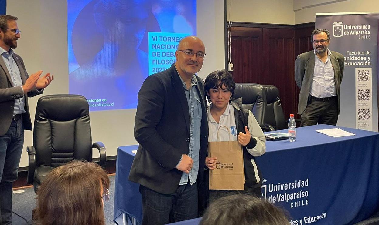 En la ocasión, el jurado premió como mejor oradora a la estudiante Priscila Garrido, del Colegio Presbiteriano David Trumbull, integrante del equipo liderado por Esteban Echaniz, estudiante tesista de Pedagogía en Filosofía UV.