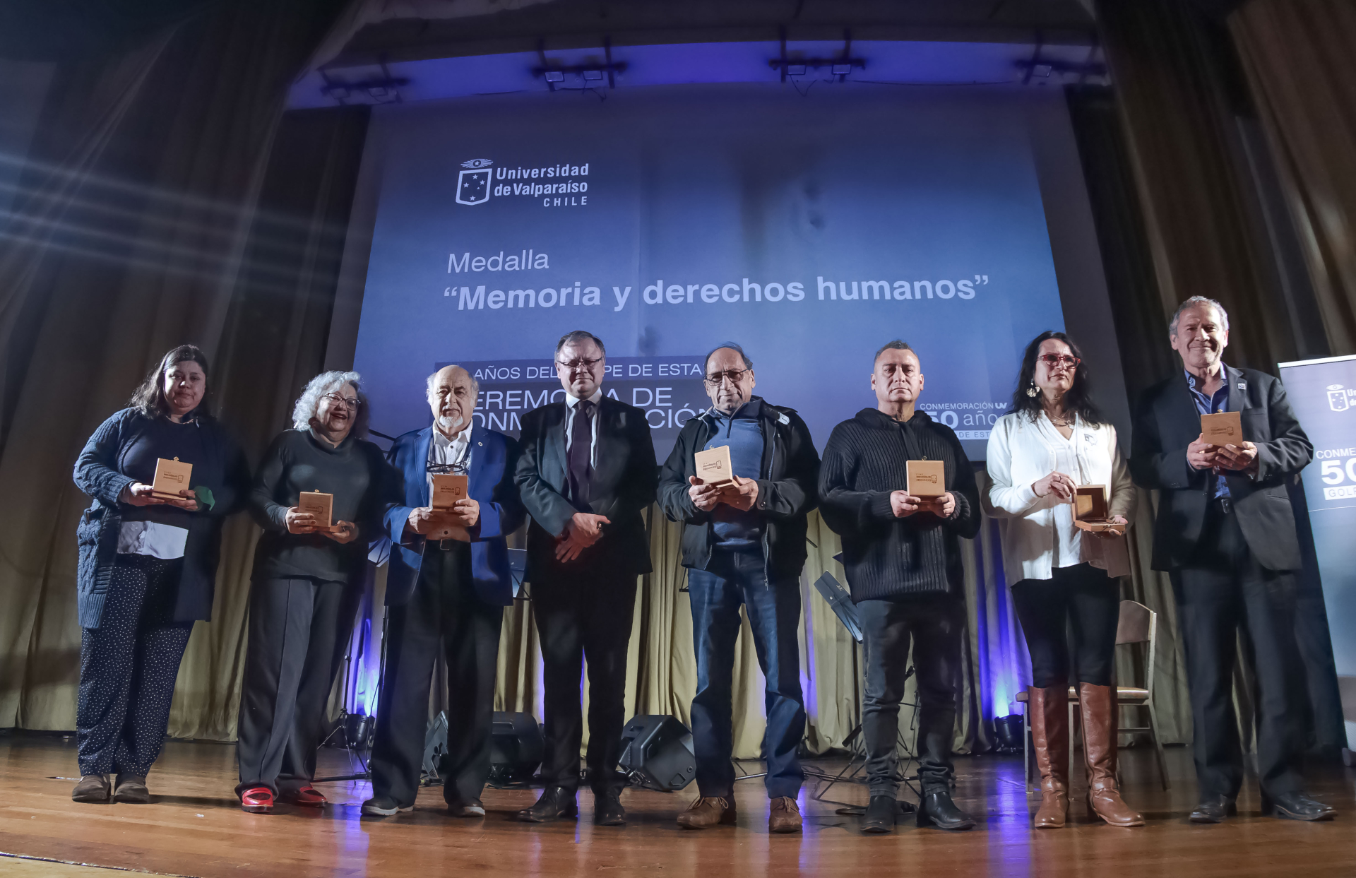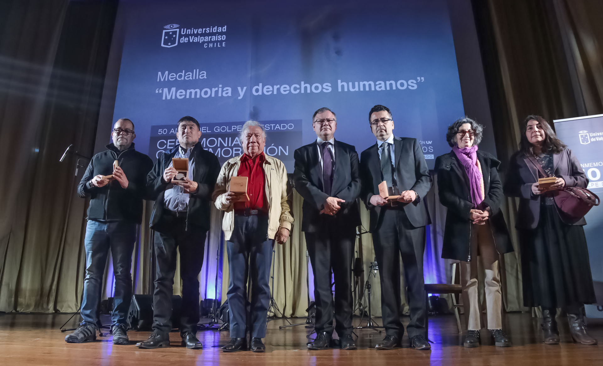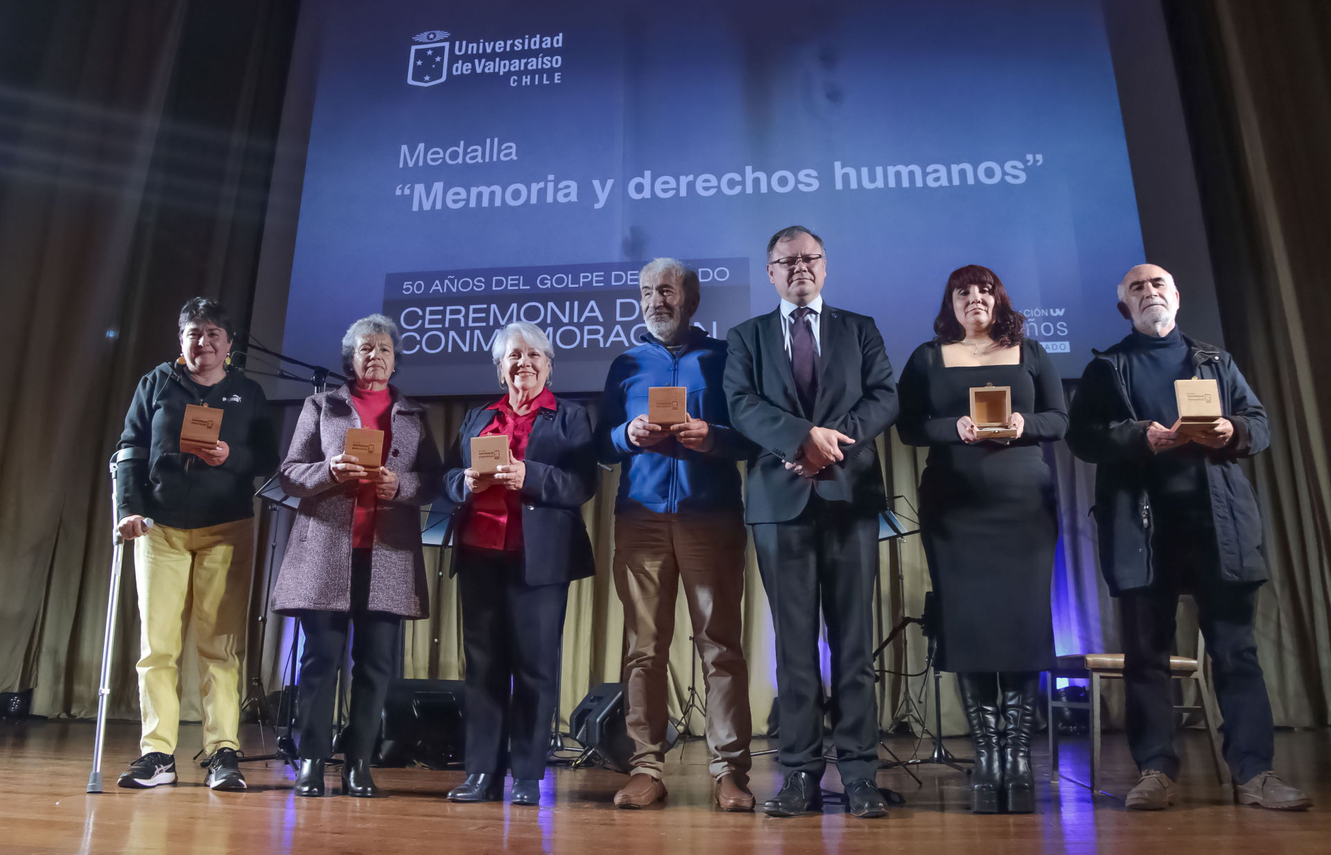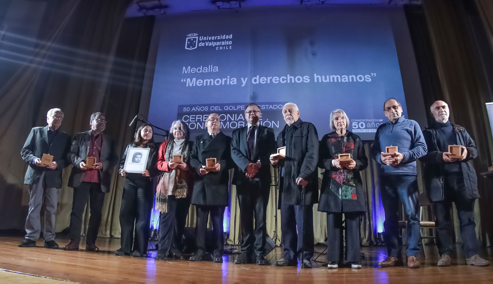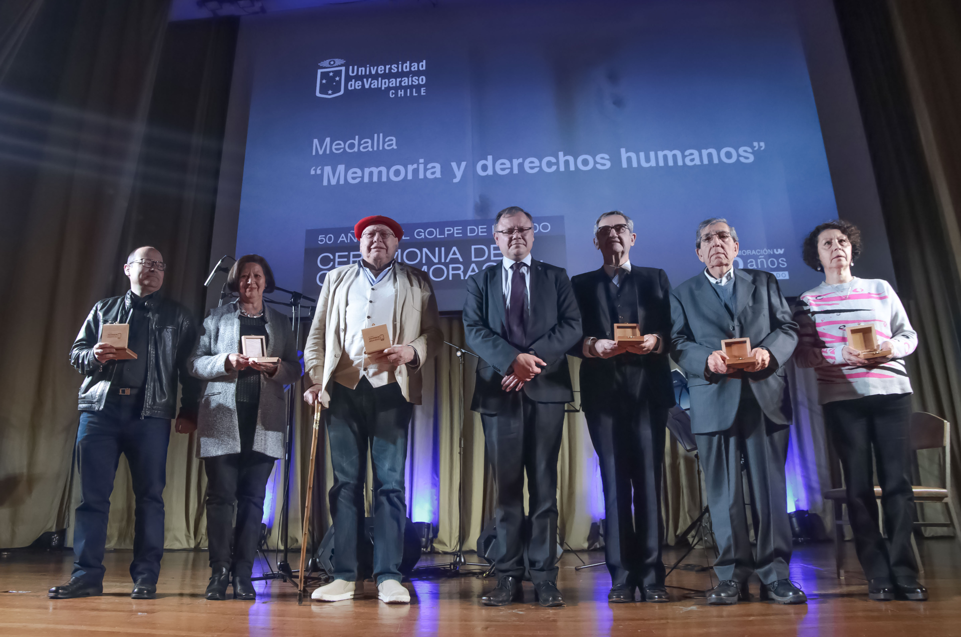 Como gesto de reparación simbólica, el rector Osvaldo Corrales entregó esta medalla a quienes voluntariamente confiaron su testimonio a la Comisión de Reparación instituida para este fin por la UV. La recibieron en el escenario integrantes de la comunidad o sus familiares, quienes accedieron a ello, mientras otros y otras fueron nombrados.