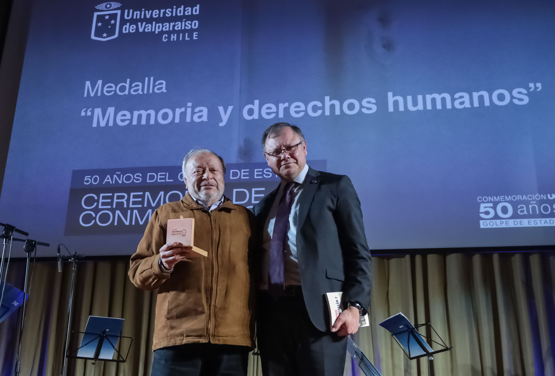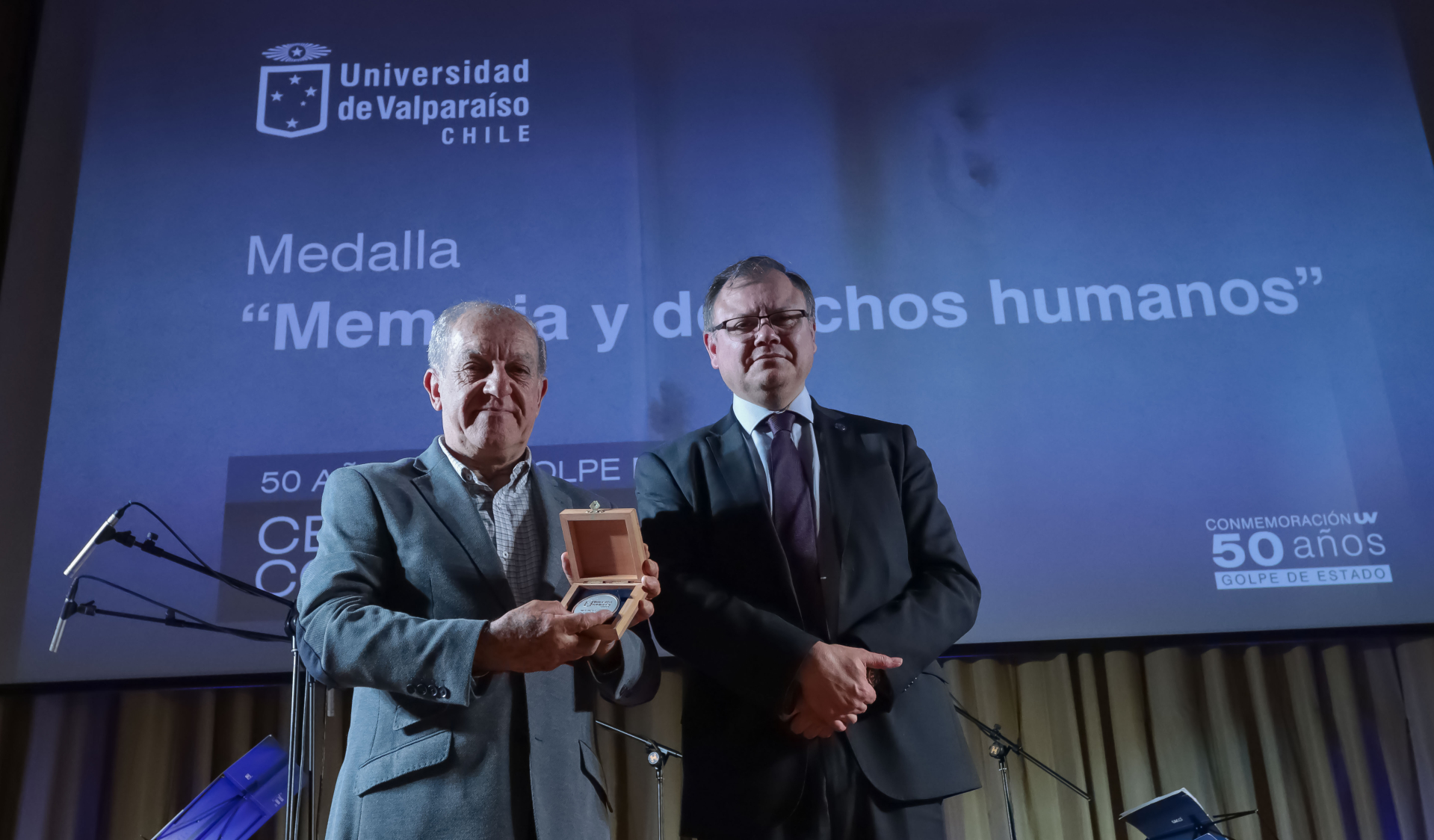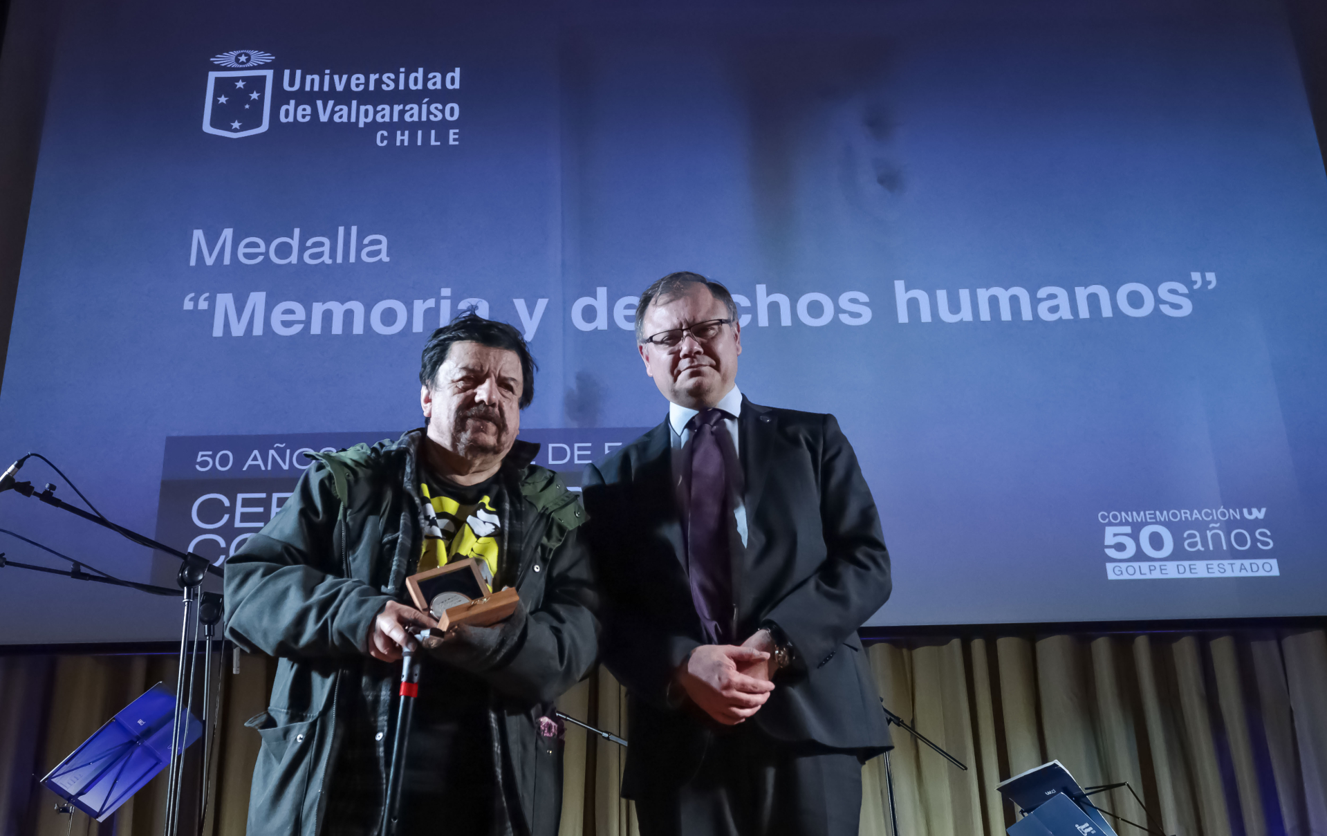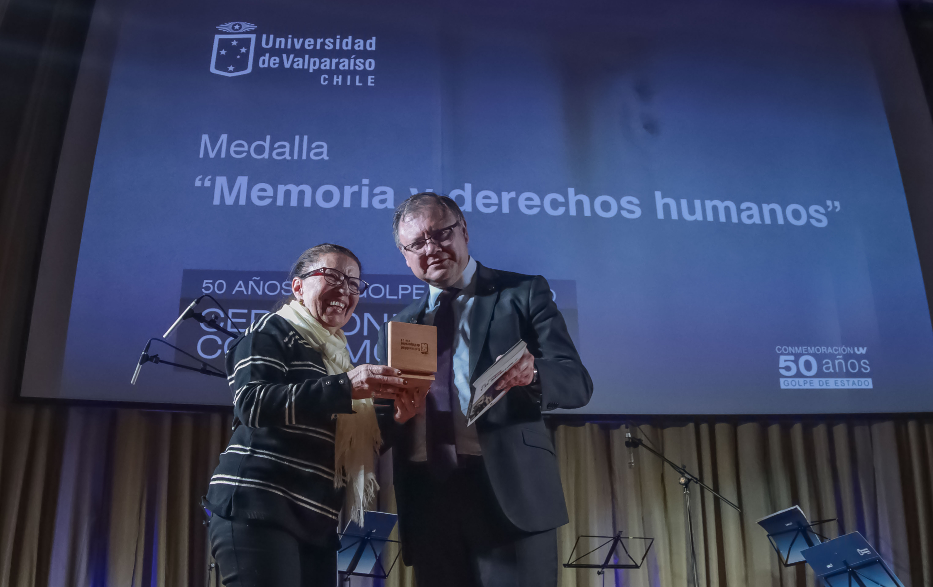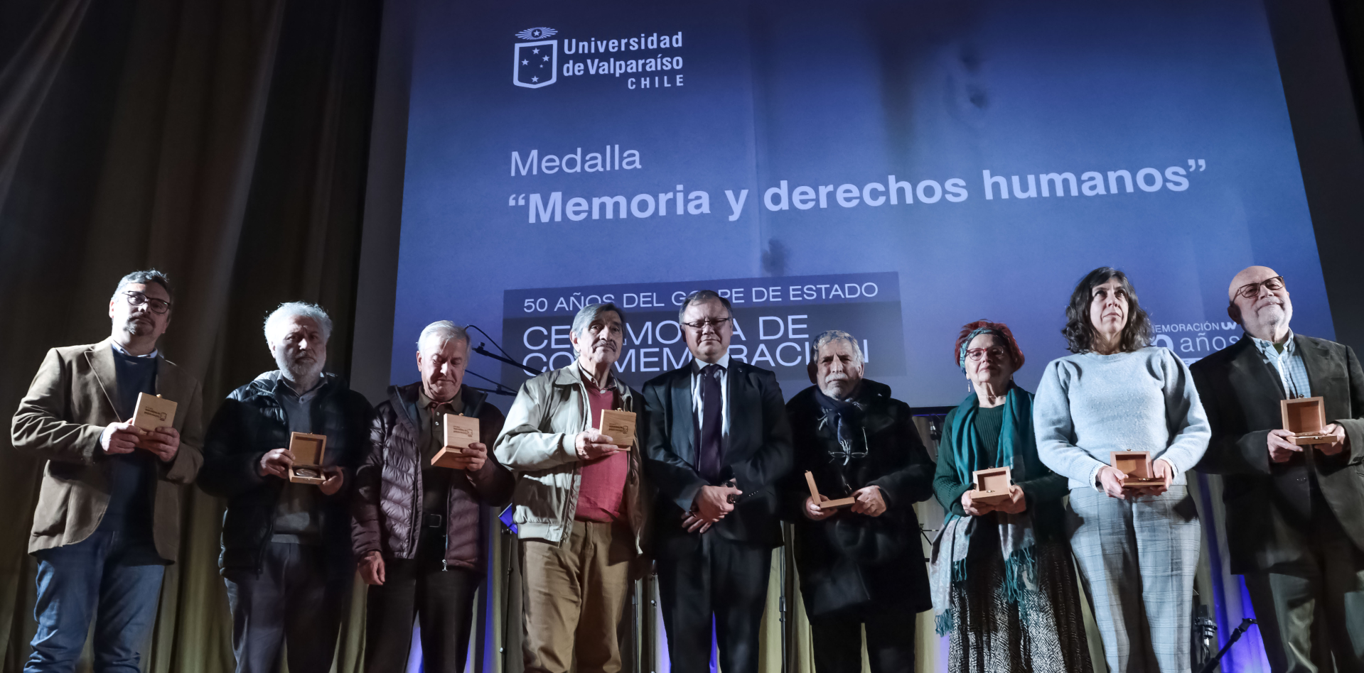Como gesto de reparación simbólica, el rector Osvaldo Corrales entregó esta medalla a quienes voluntariamente confiaron su testimonio a la Comisión de Reparación instituida para este fin por la UV. La recibieron en el escenario integrantes de la comunidad o sus familiares, quienes accedieron a ello, mientras otros y otras fueron nombrados.