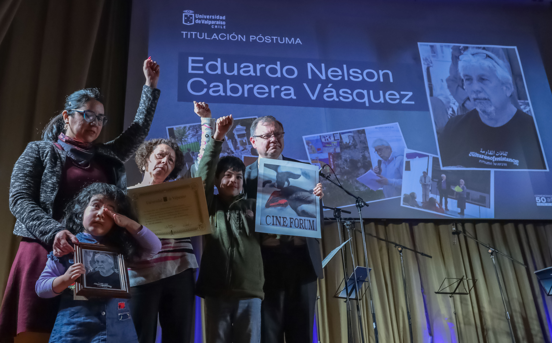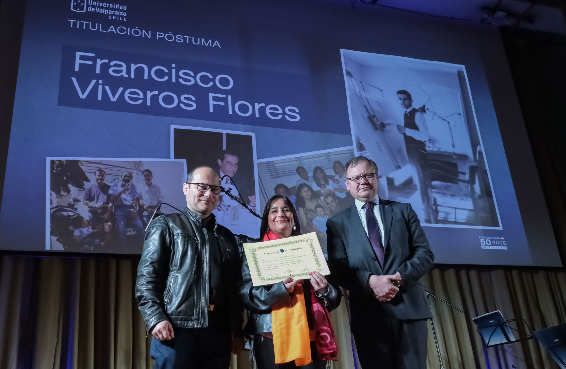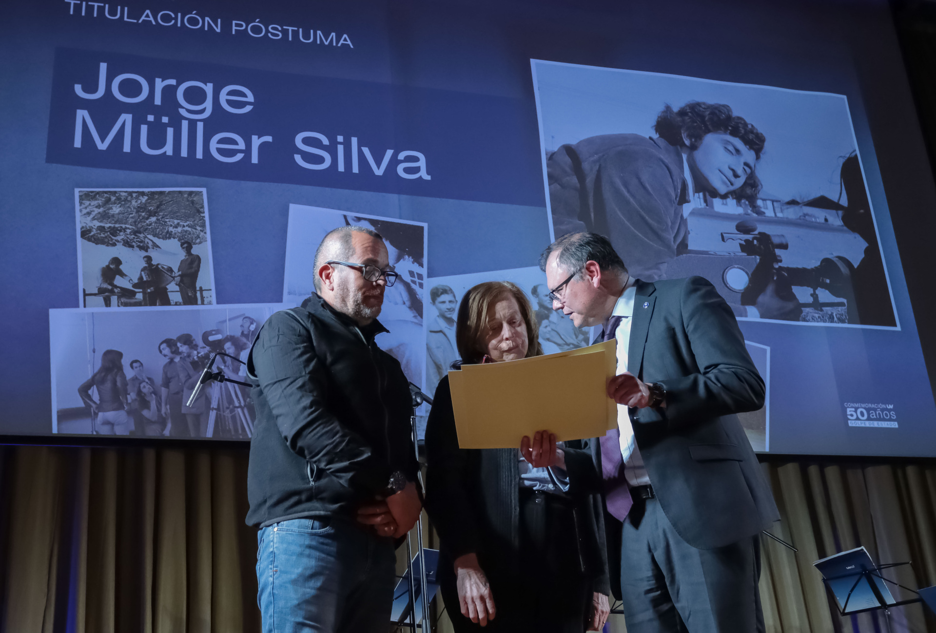 Junto con la entrega de la Medalla Memoria y Derechos Humanos, otro de los puntos más emotivos de la ceremonia fue la titulación póstuma de tres personas: Eduardo Nelson Cabrera Vásquez, titulado de la carrera de Filosofía; Francisco Viveros Flores, titulado de la carrera de Arquitectura, y Jorge Hernán Müller Silva, titulado de la carrera de Cine.